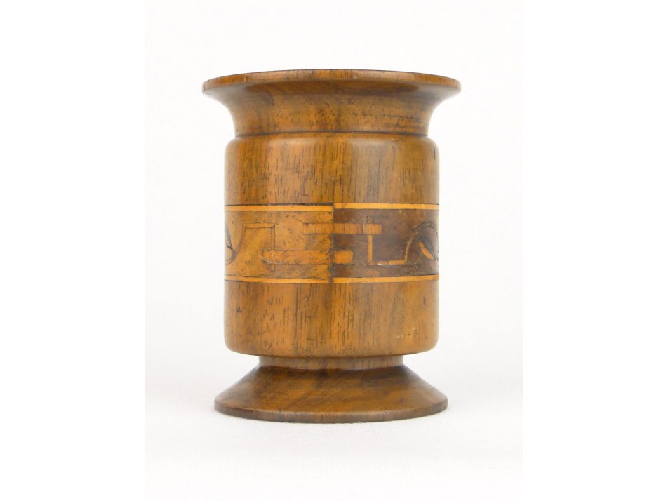 Régi, szép állapotú, egy fából faragott, oldalán körben intarziával díszített gyógyszertári famozsár alja.