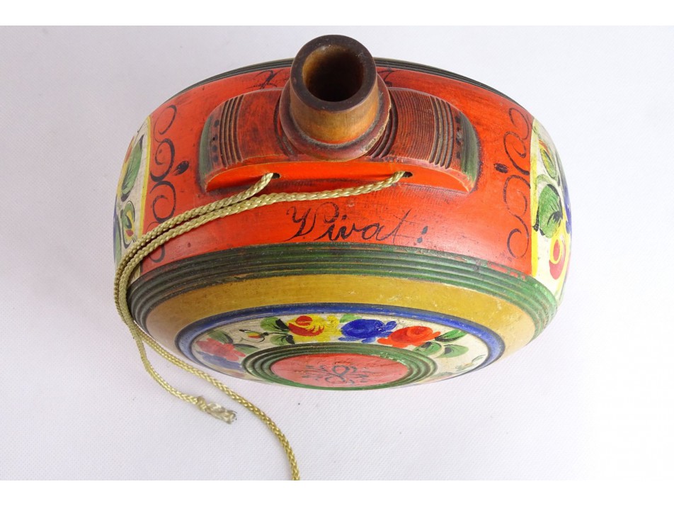 Nagyon régi, hibátlan állapotú, egyetlen fából faragott, feliratos, néprajzi gyűjteménybe illő kulacs, butykos. Nyakánál két oldalt felirat: VIVÁT!