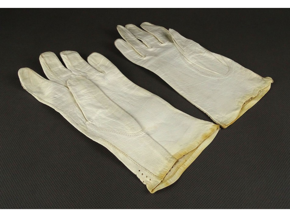 Szép állapotú kis méretű törtfehér női bőrkesztyű, kesztyű. Használat nyomai finoman láthatóak rajta.