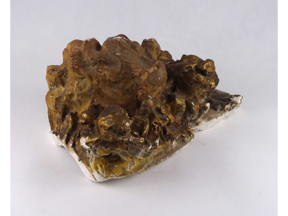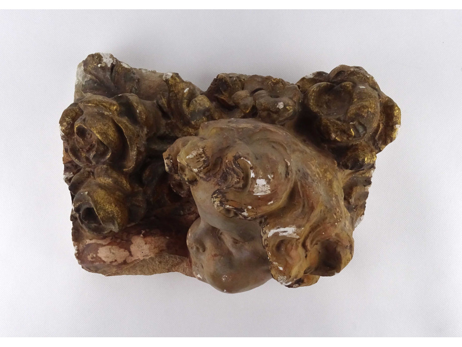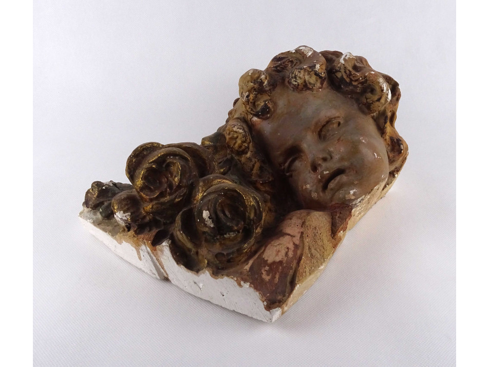 Antik, barokk angyalarcot, fejet ábrázoló épületdísz töredék, gipsz stukkó. Eredeti festése, laparanyozása itt - ott kopottas, de így is látványos, dekoratív darab.