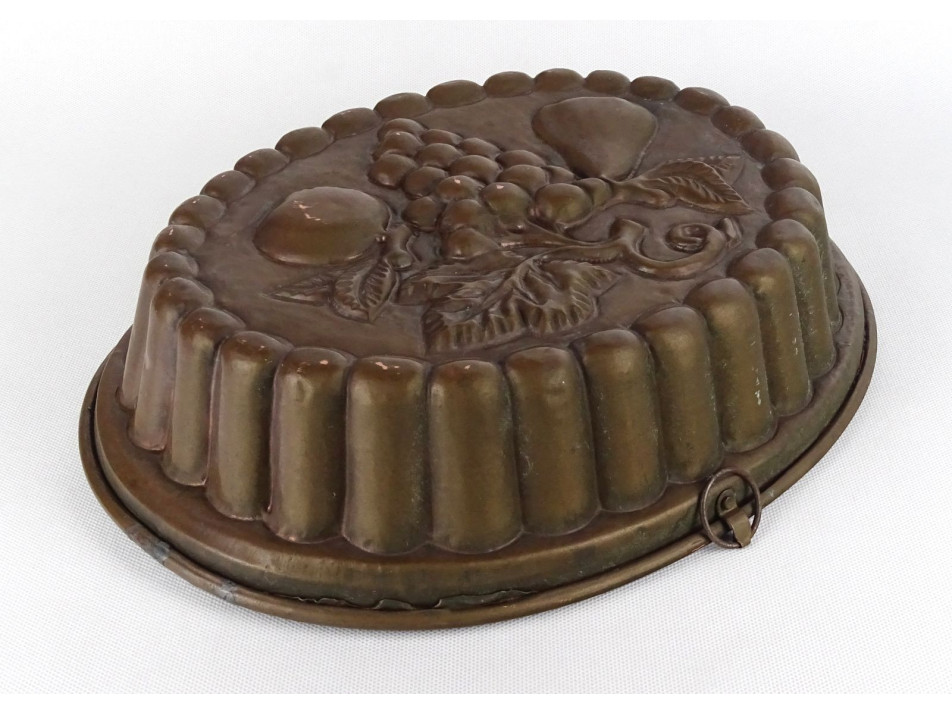 Régi konyhai, cukrászati eszköz. Akasztási lehetőséggel rendelkező nagy méretű sütemény sütő forma. Belső felülete ónózott. Alján szőlőfürt, körte és alma formák láthatók.