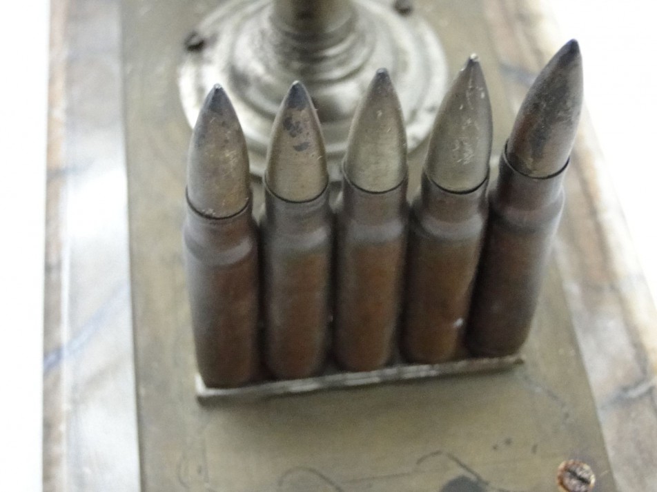 10 töltényhüvely díszítéses asztali hadi emlék, alatta gravírozott felirattal, márvány szerű talapzaton.