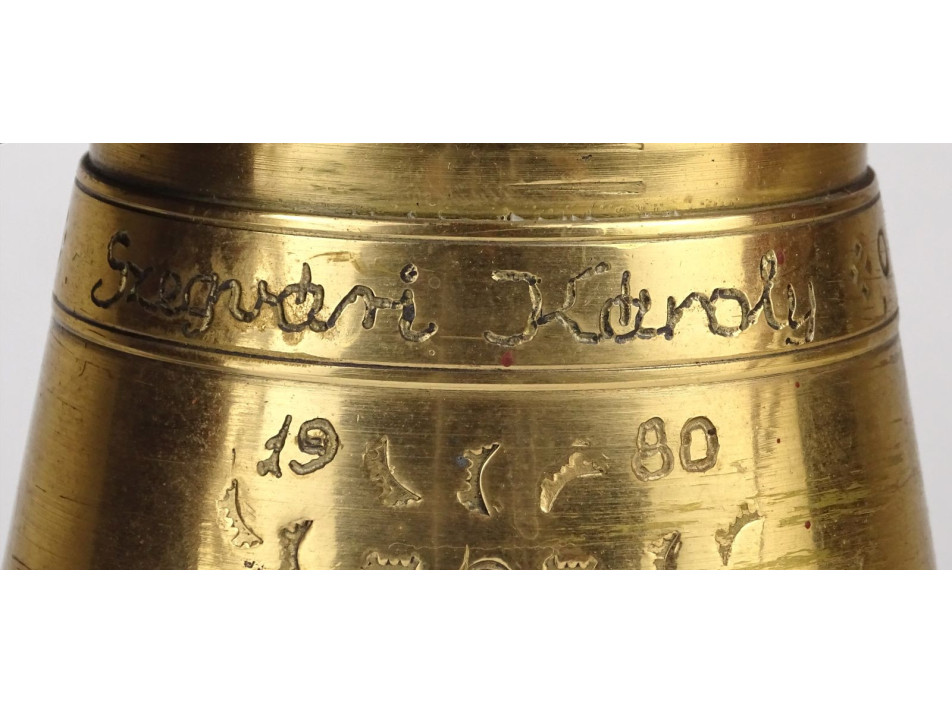 Bőr szíjas nagyméretű réz kolomp marhakolomp Szegvári Károly 1980