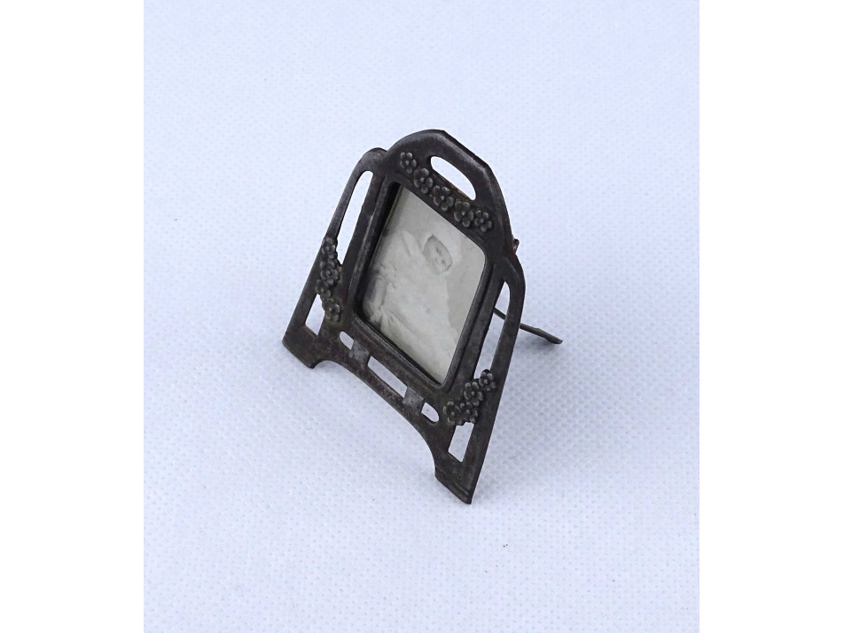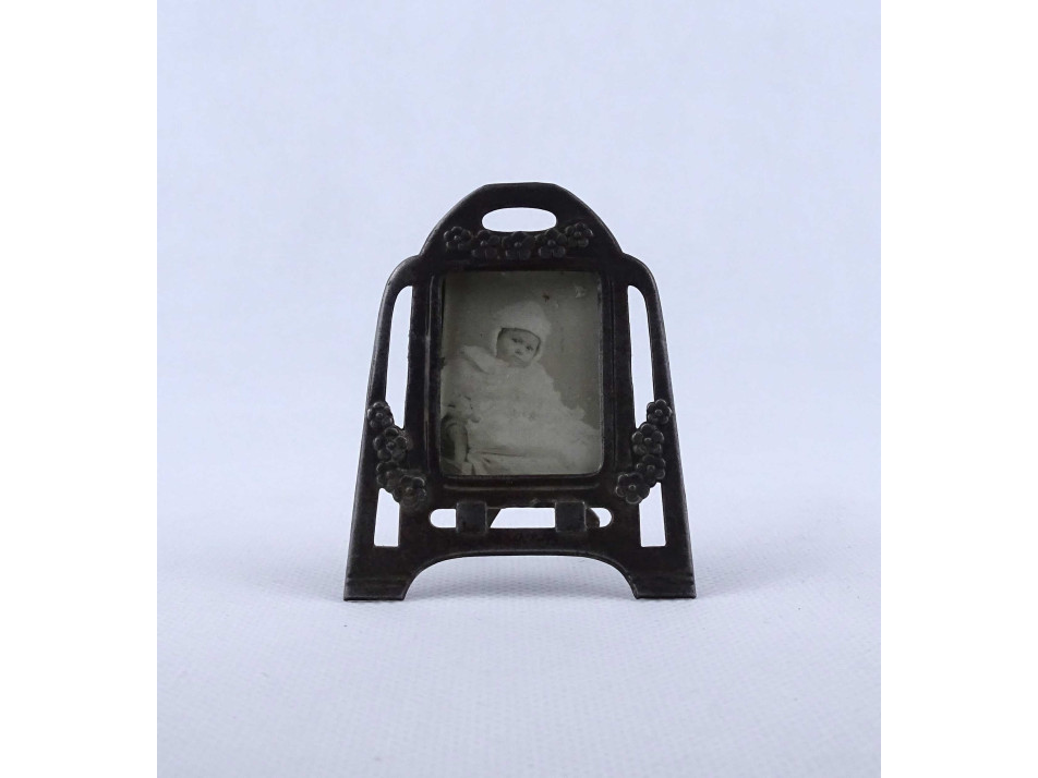 Antik, kisméretű, díszes különleges szecessziós, virágdíszes, acélból készült talpas fénykép keret, fotókeret, keret üveglappal, szép állapotban. Benne egy kisméretű babafotó.
