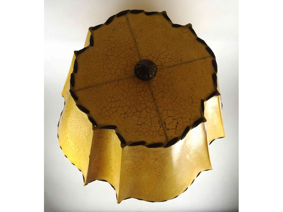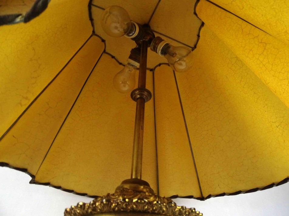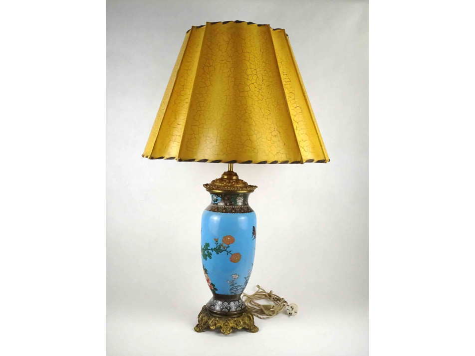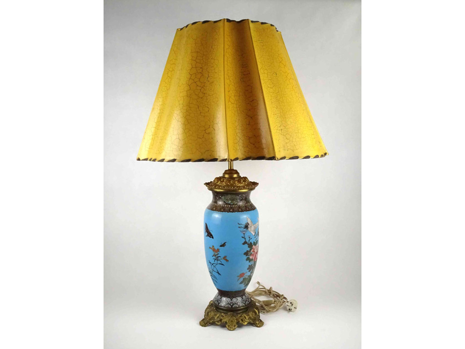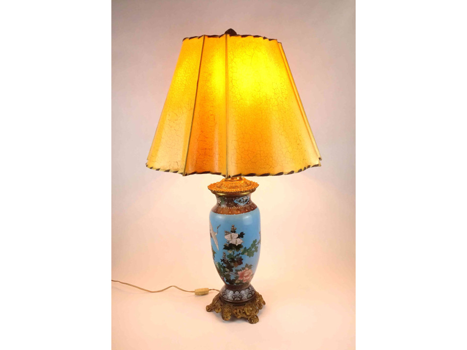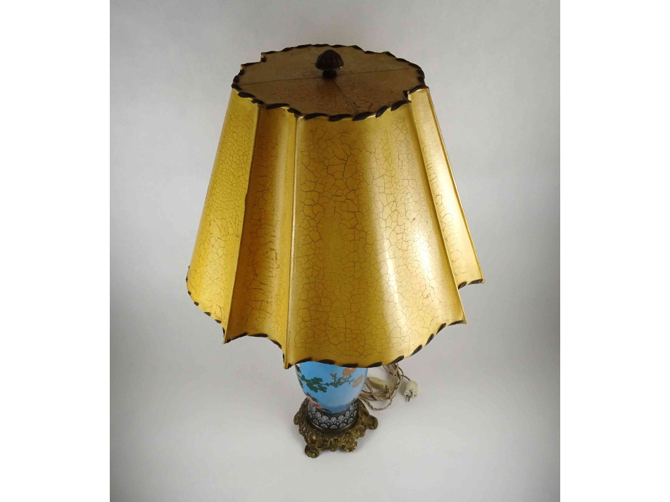 Régi, hatalmas méretű tűzzománc, rekeszzománc lámpa, asztali lámpa, teljesen ép sárga papír burával. Áttört bronz talapzaton álló, aprólékos kidolgozású darvas, pillangós és virágos díszítésű kelti zománc munka. A lámpa teste sárgarézből készült háromégős, nagyméretű (E27) porcelán foglalatos. Földelt dugajjal rendelkezik, működő állapotban van.