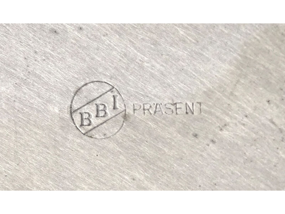Régi jelzett ezüstözött fém BBI Prasent nyeles asztali hamutartó serpenyő 32 cm