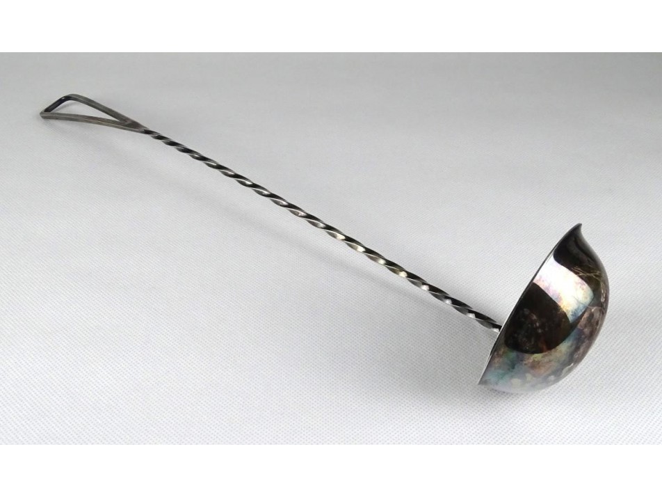 Nagyon régi, jelzett, nagy méretű, vastagon ezüstözött WMF alpacca merőkanál. Különleges csavart nyelű, áttört, akasztható véggel.