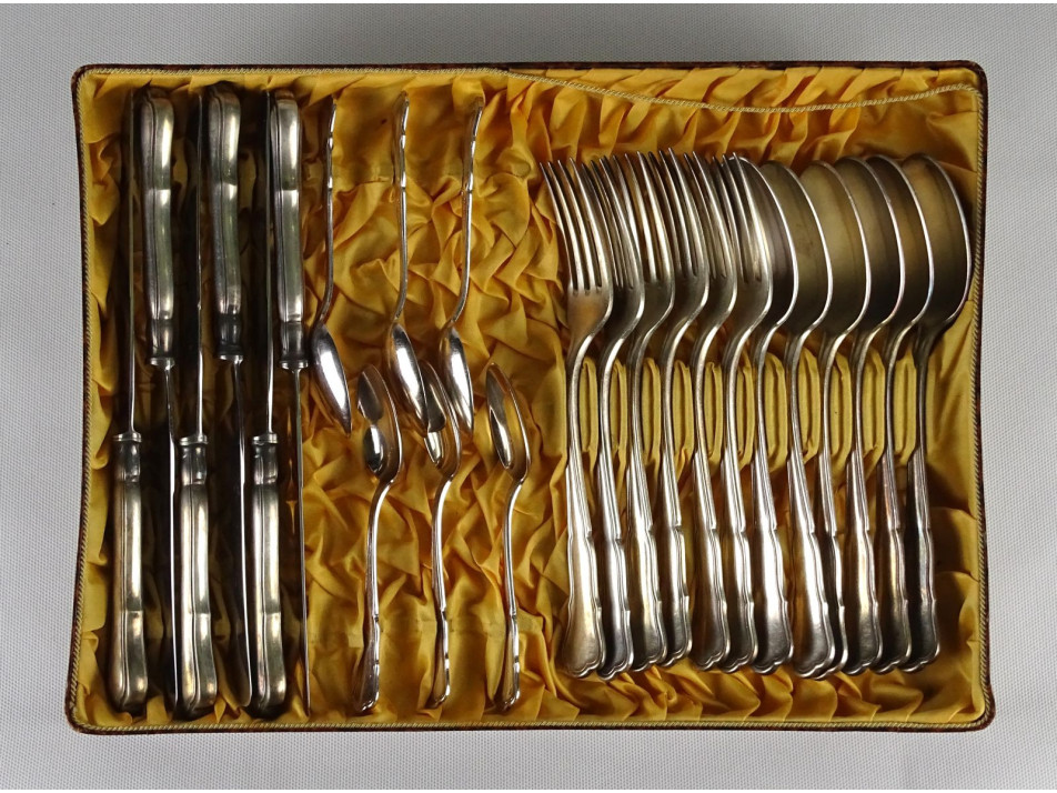 Régi, szép állapotú, vastagon ezüstözött evőeszköz készlet díszdobozában.