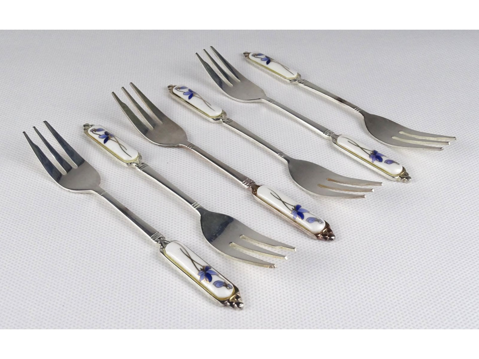 Régi, hibátlan állapotú, evőeszköz készlet eredeti díszdobozában. Hat darabos villa készlet, süteményes villa készlet. A villákon kézzel festett, aranyozott virágdíszes porcelánbetét található.