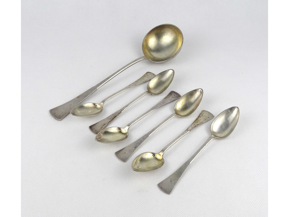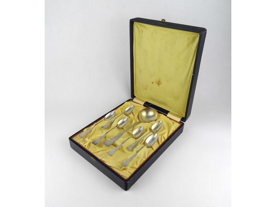 Antik monogramos 800-as ezüst kiskanál készlet és merőkanál dobozban 7 db 208 g