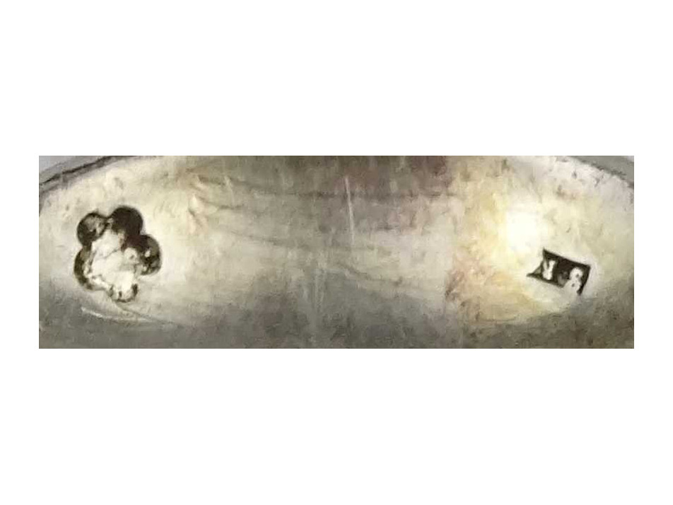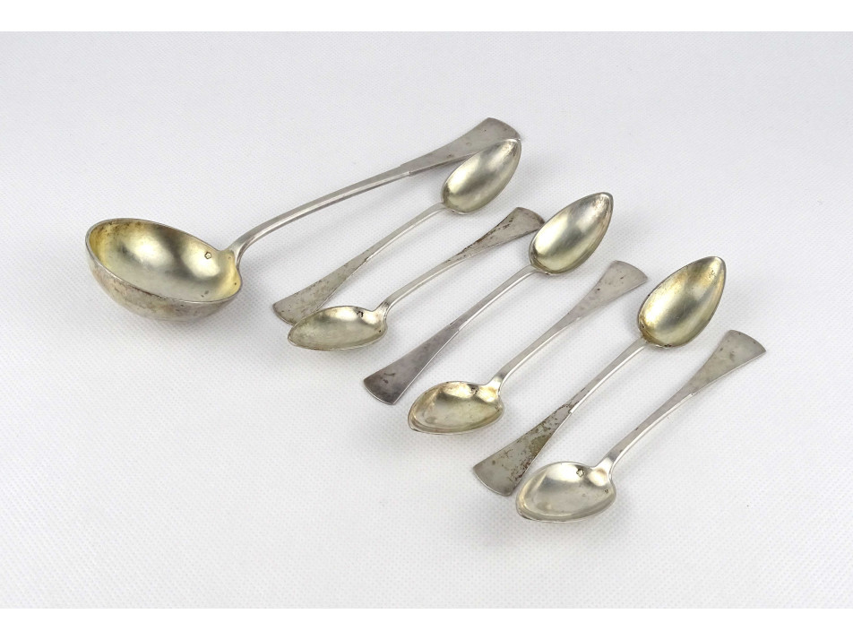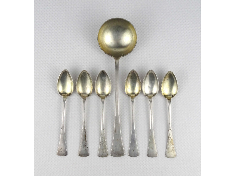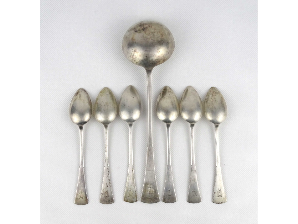 Antik, 800-as finomságú, monogramos hat darabos ezüst kis kanál készlet, és merőkanál pamut béléses díszdobozban. Rajtuk jobbra néző 3-as Dianna fejes 800-as finomságjelzés. A kiskanalakon SZN mesterjegy, a merőkanálon WT mesterjegy látható.