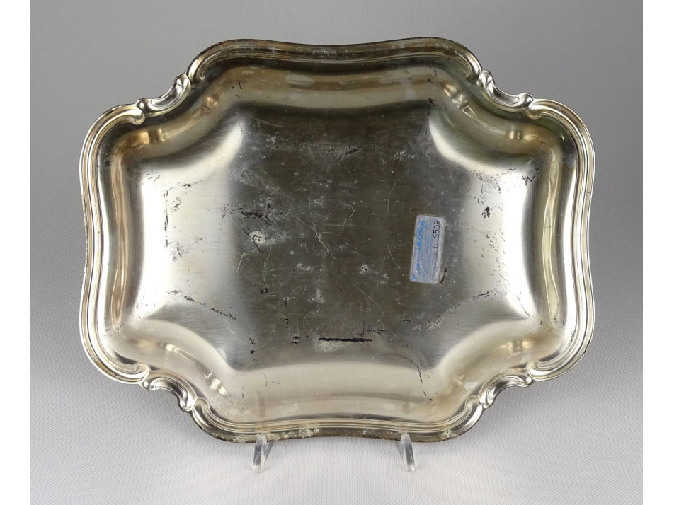 Régi ezüstözött jelzett asztalközép kínáló tál, gyümölcskínáló tál. A tál peremén barokkos díszítés fut körbe. Ezüstözése kopottas.