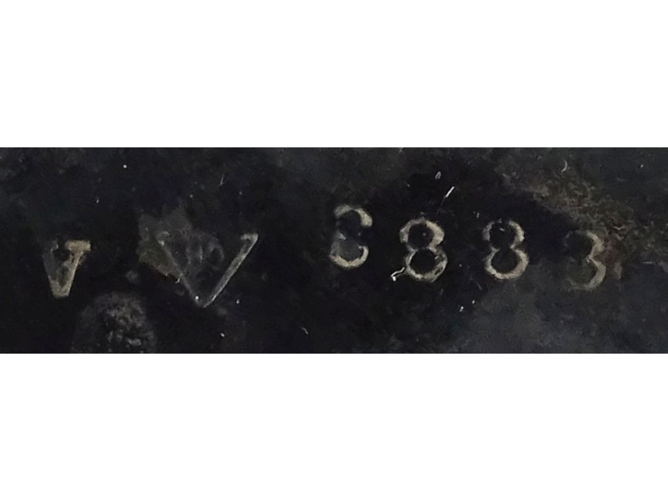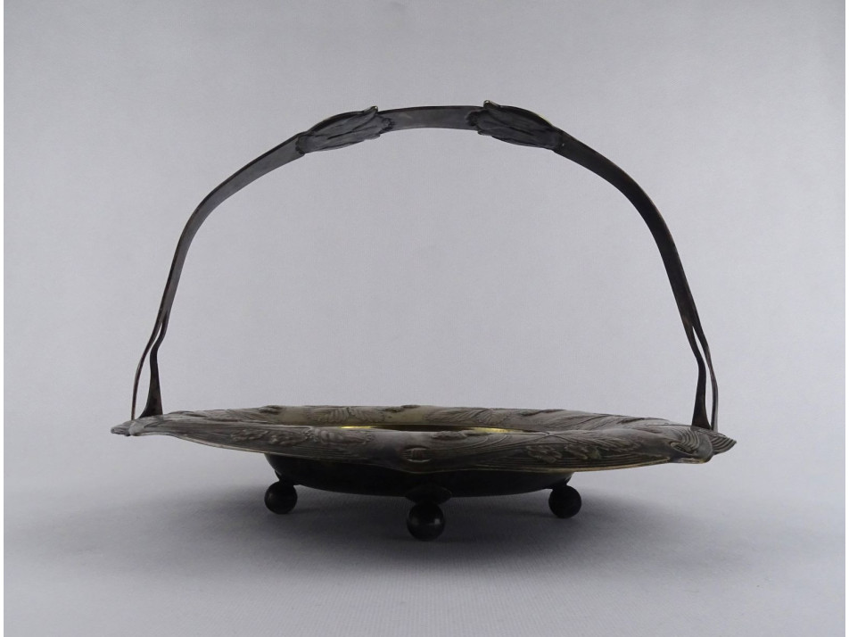 Antik, szép állapotú, nagyméretű, négy gömb lábon álló, ezüstözött, szamócával és pillangóval díszített jelzett asztalközép kínáló tál, gyümölcskínáló tál.