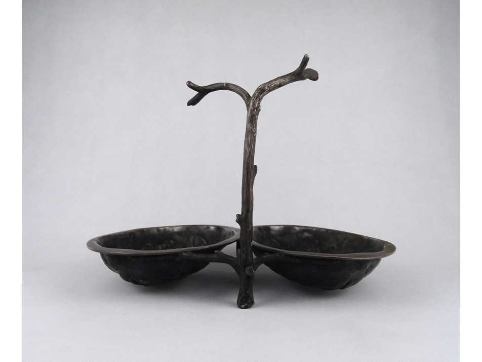 Antik, hibátlan állapotú Berndorf ezüstözött asztali zsebóra tartó. Két fél diót formáló kínáló résszel, plasztikus faágat formáló fogantyúval és lábakkal rendelkezik. Patinás darab.
