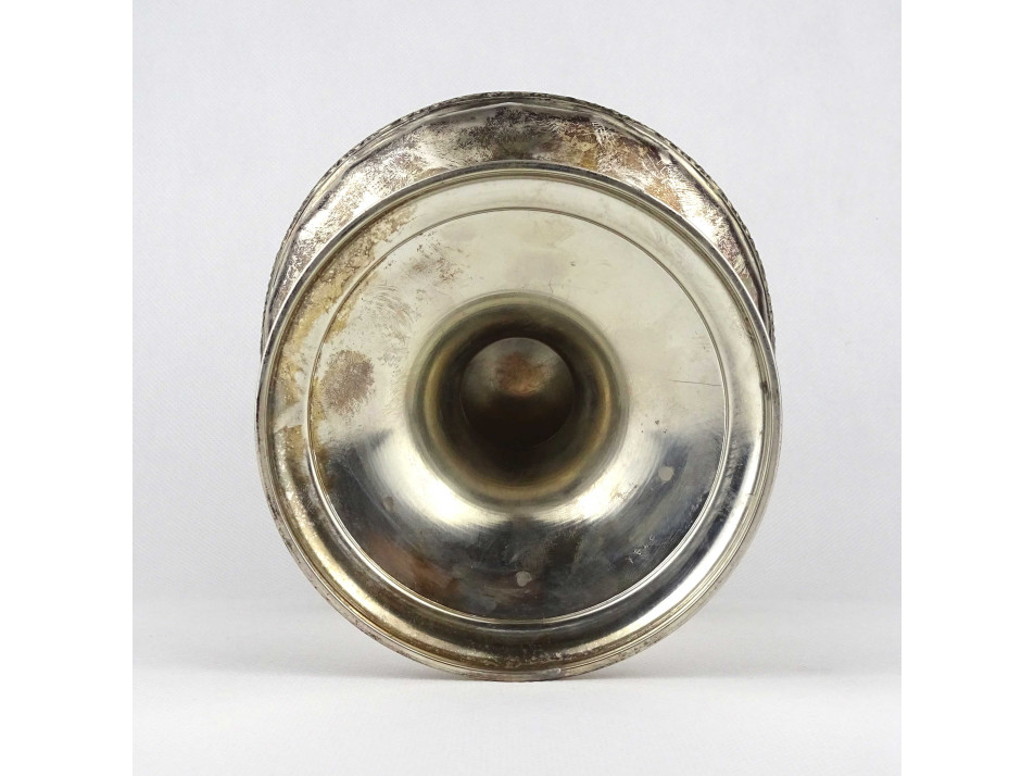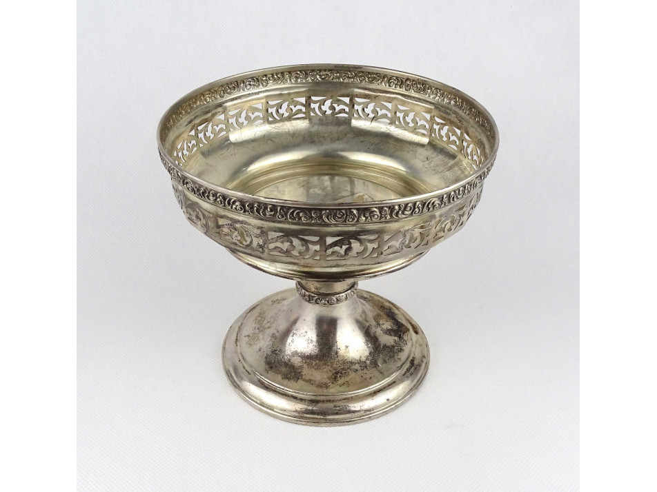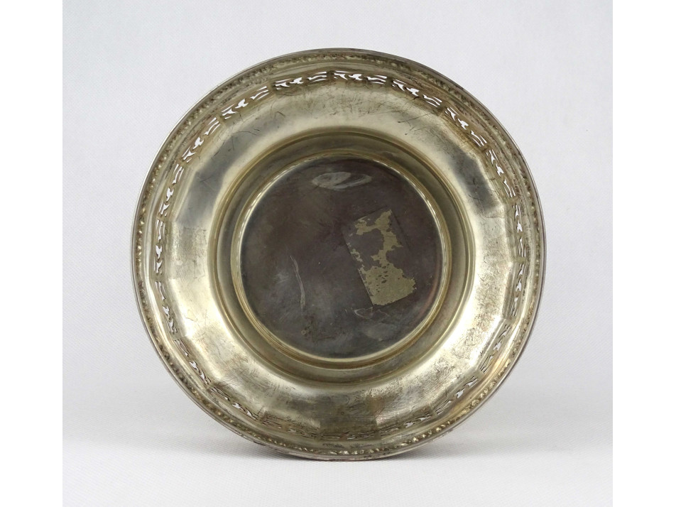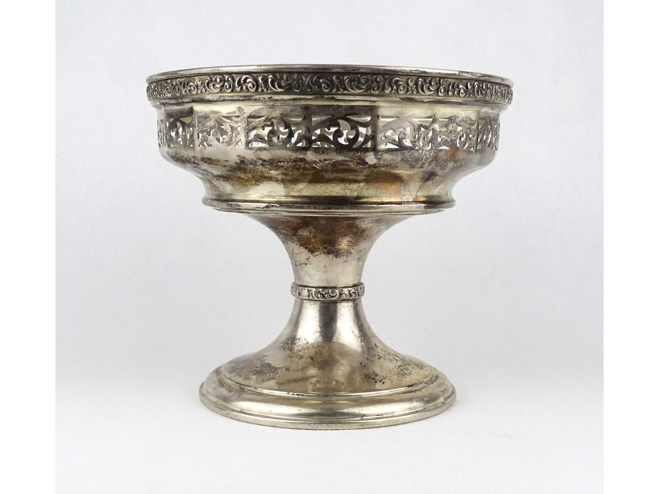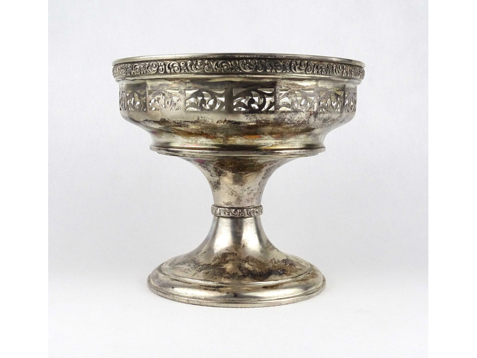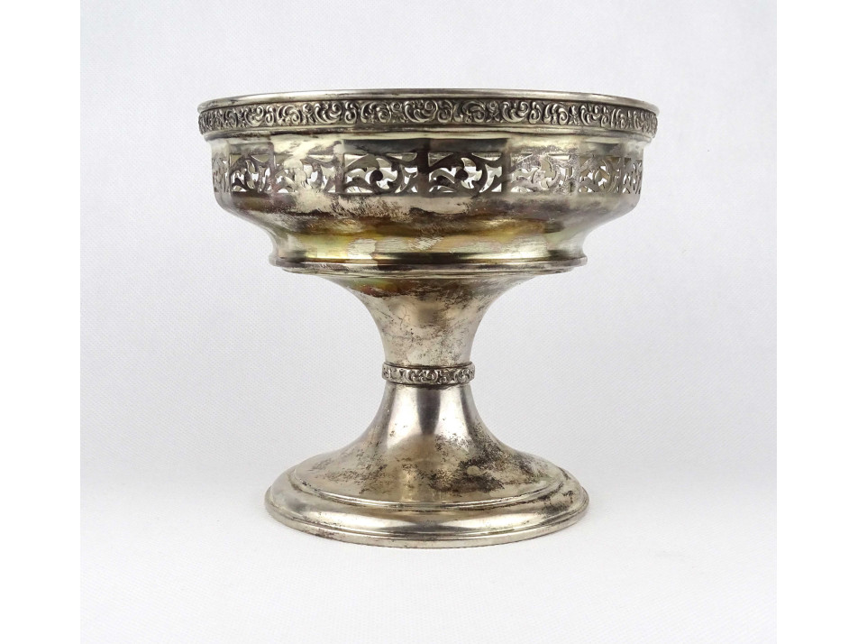 Régi, ezüstözött fém, áttört oldalú asztalközép kínáló, gyümölcskínáló. Üvegbetétje hiányzik.