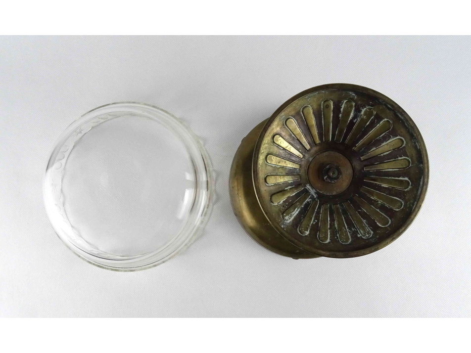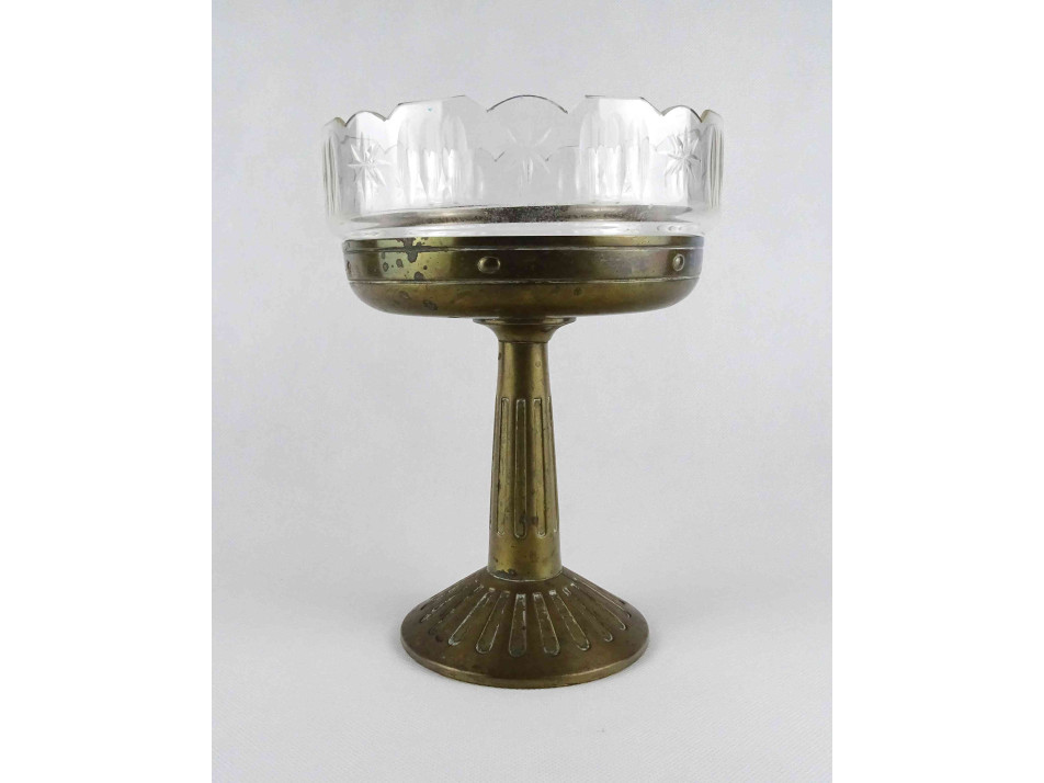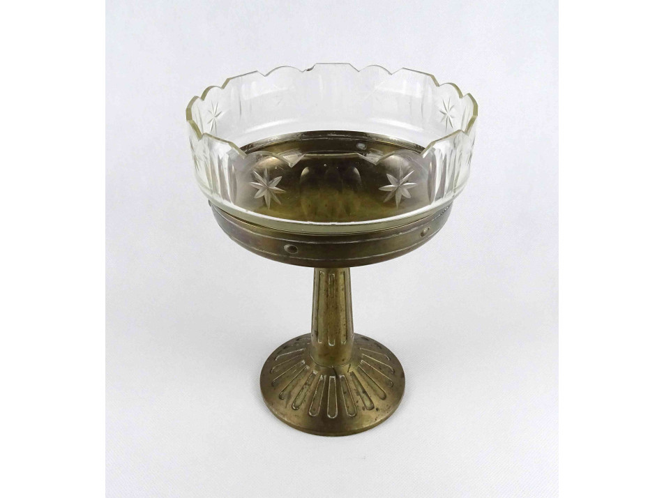 Antik, jelzetlen, sárgarézből készült, egy oszlopon álló talpas kínáló tál, asztalközép, csiszolt üvegbetéttel. A réz felületek patinásak, az üvegtál peremén egy lepattanás látható.
