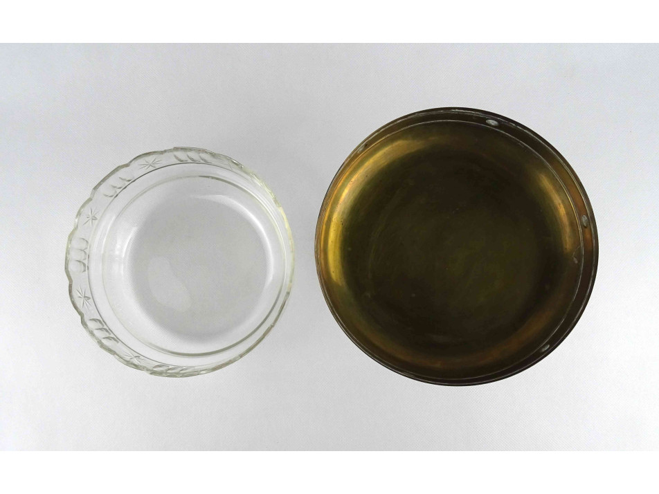 Antik sárgaréz talpas üvegbetétes asztalközép gyümölcs kínáló 24 cm