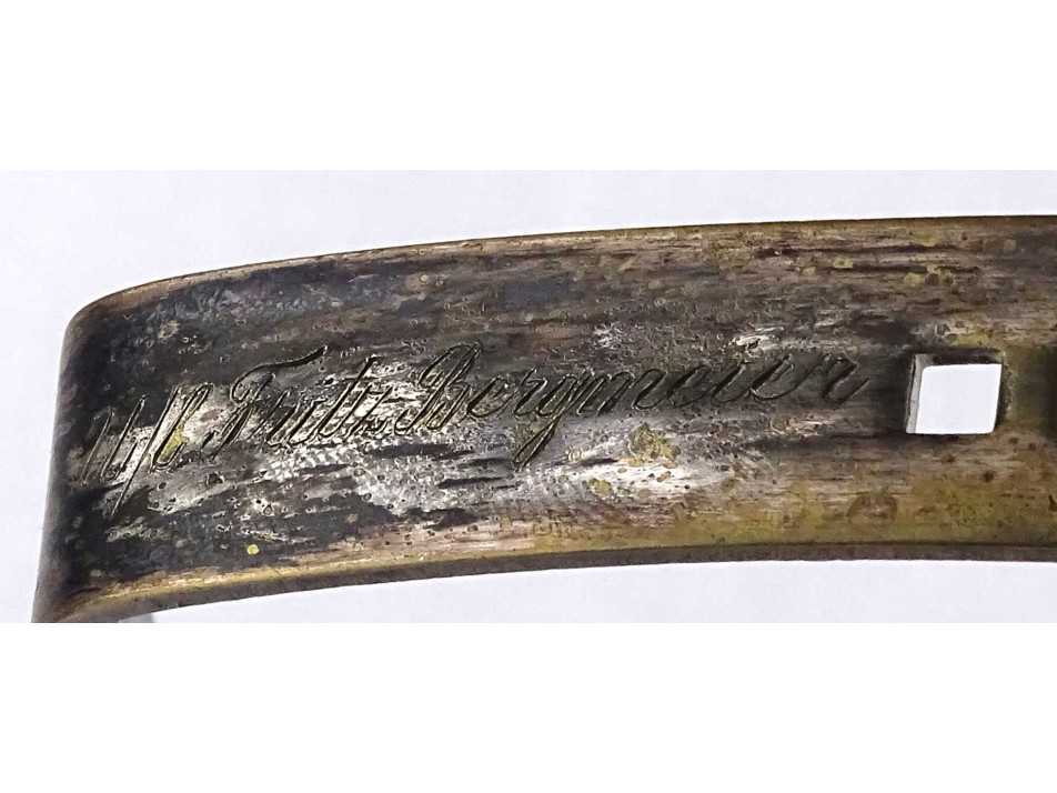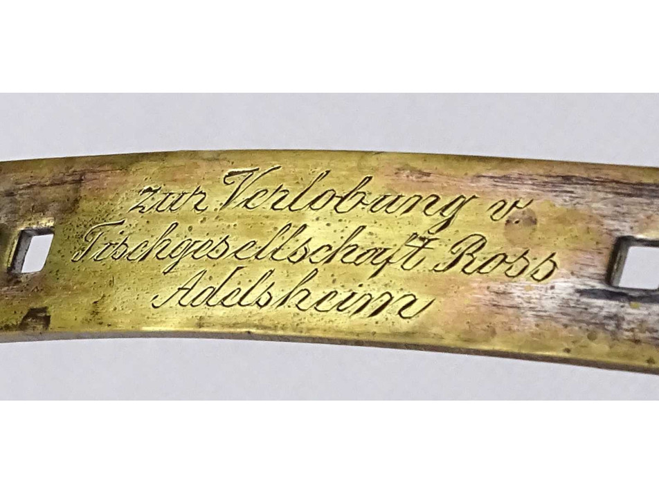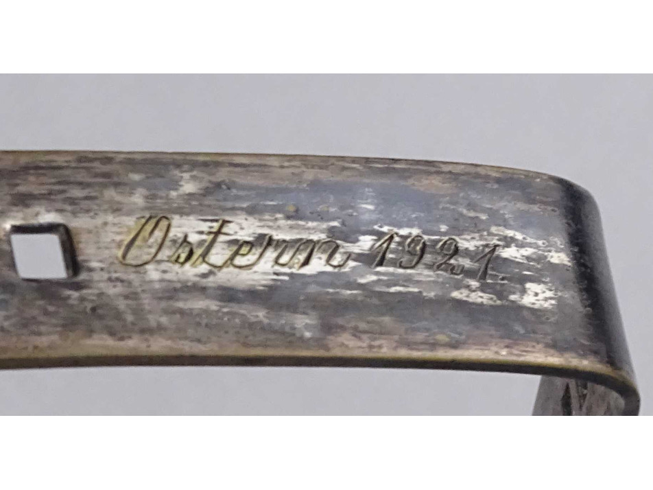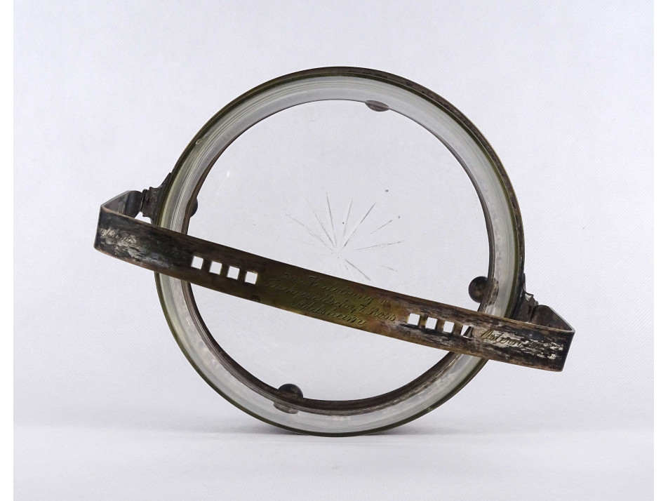 Régi, szép állapotú, ezüstözött, domború rózsa díszítéses réz kínáló kosár, asztalközép, kivehető üvegbetéttel. Az üvegbetét peremén több apró lepattanás látható. Ezüstözése kopottas. A kosár fogóján vésett német nyelvű ajándékozási felirat.