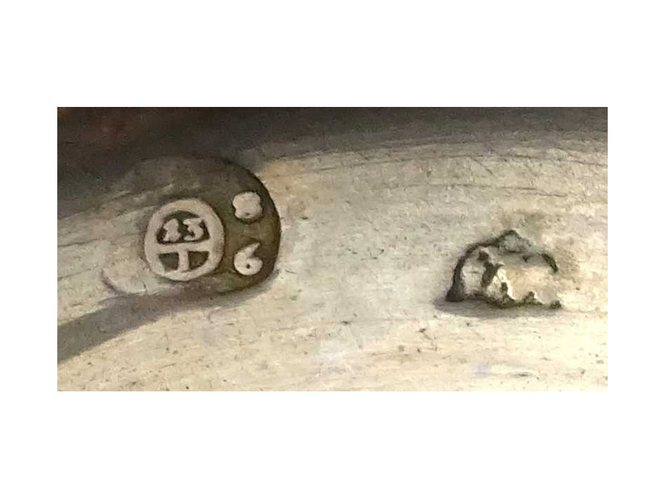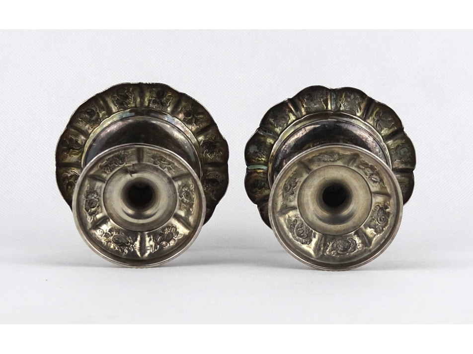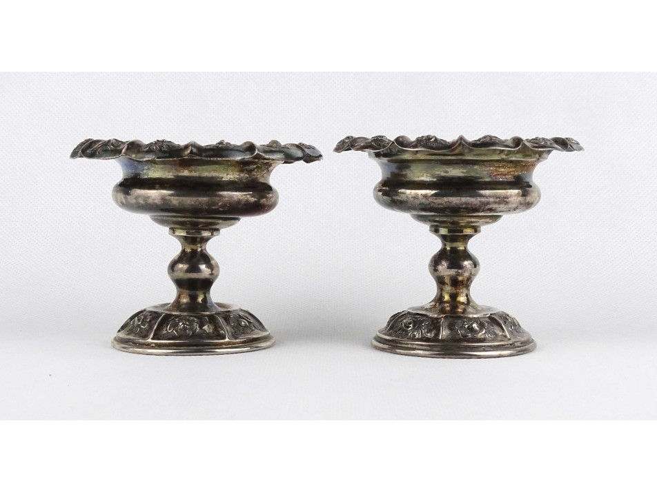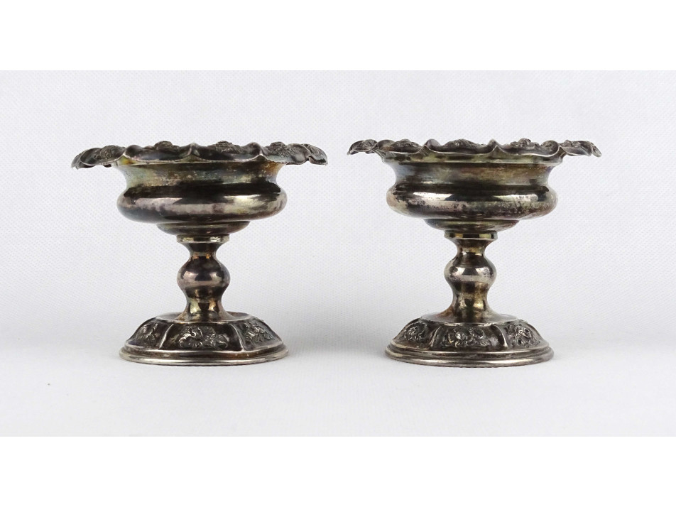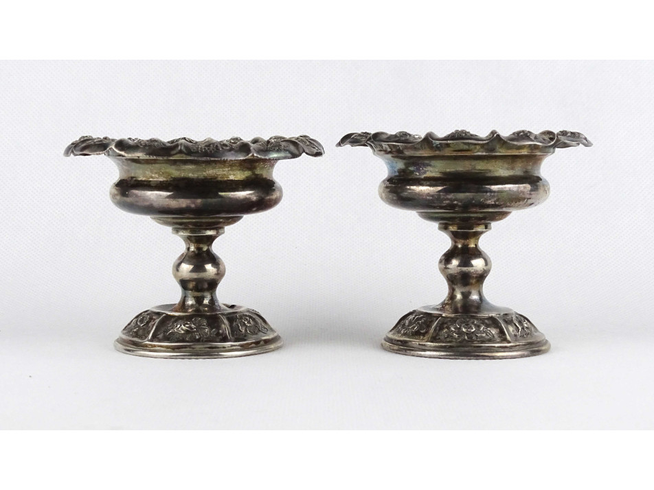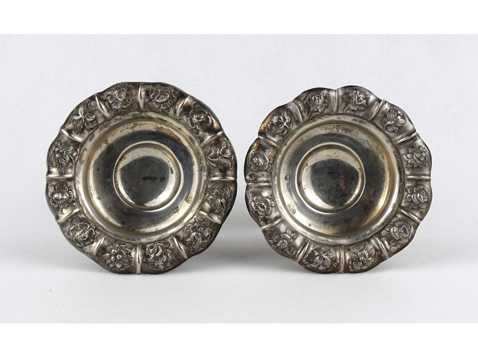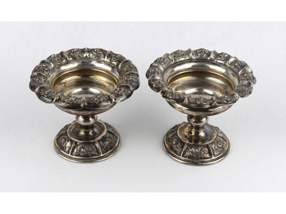 Antik, 13 lattos domború virágmintával gazdagon díszített bécsi ezüst, talpas szószos vagy fűszertartó tálka pár. Rajtuk 1846-os bécsi 13 latos fémjel, mellette elmosódott mesterjel látható.