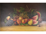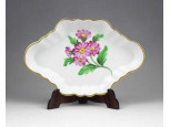 Antik, jelzett 800-as finomságú vésett virágmintával és monogrammal díszített ezüst kínáló tál. Aljába felülről beütve megtalálható az 1937 előtti és az 1937 utáni 3-as Diána fős 800-as finomságjel is. A tál aljának közepére a KSH monogramot vésték.