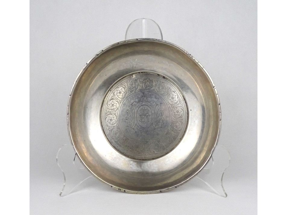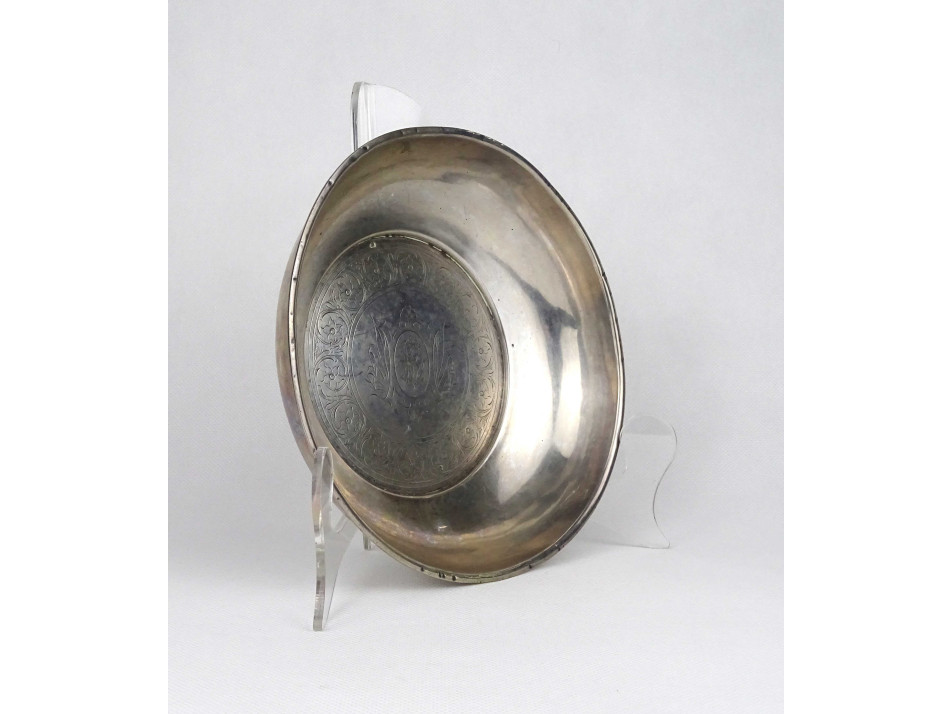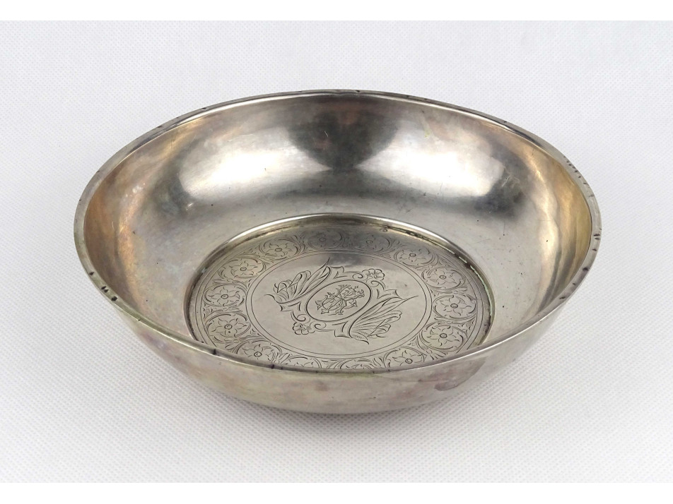 Antik monogramos vésett aljú ezüst kínáló tál 199 g
