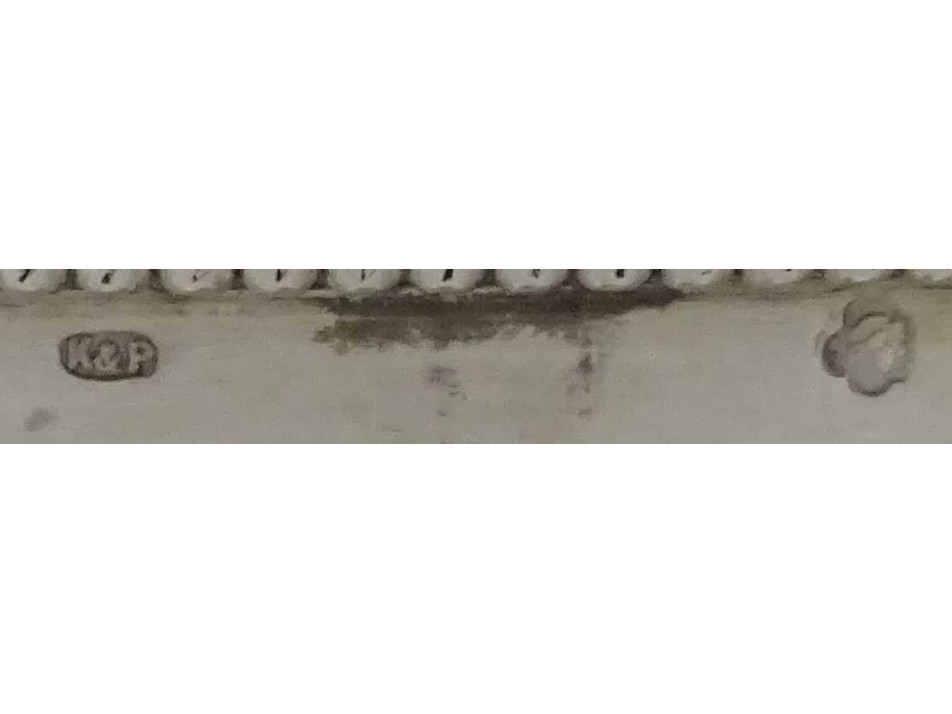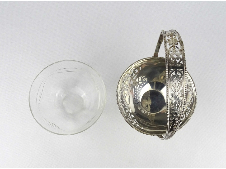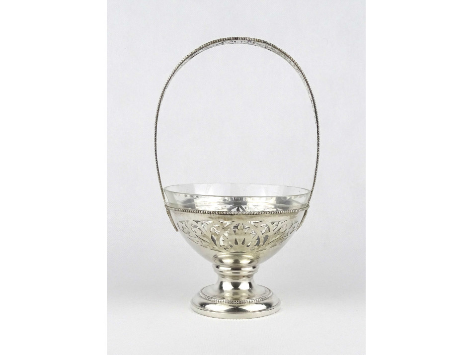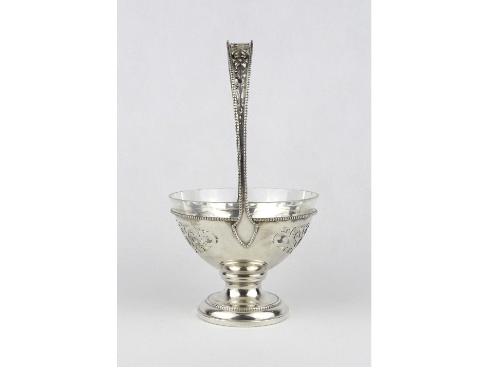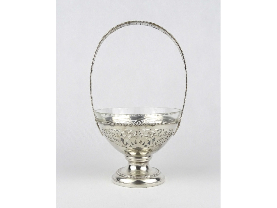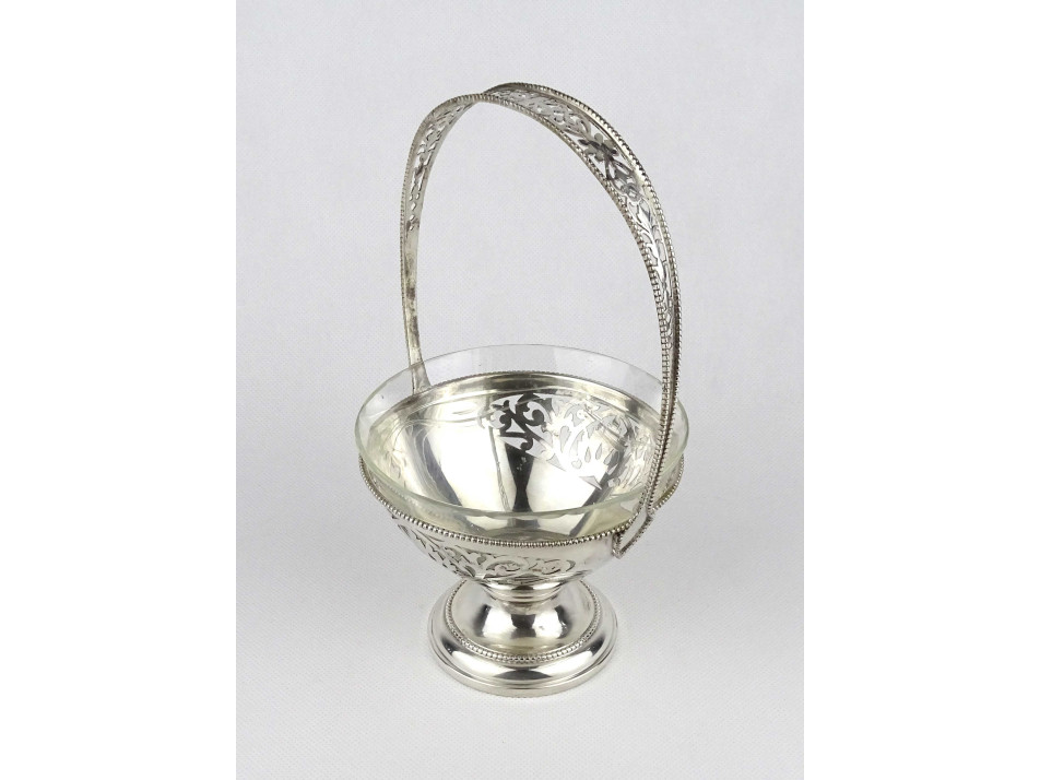 Antik, 800-as finomságú áttört ezüst kínáló kosár, aszatalközép, hibátlan állapotú csiszolt üvegbetéttel. Peremén beütött 1937 előtti 3-as Diána fős 800-as finomságjel, mellette " K&P " mesterjel látható.
