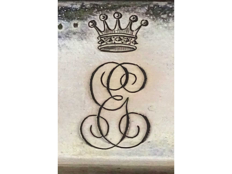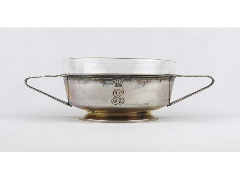 Antik, jelzett 800-as finomságú ezüst kínáló kosár, kistál, hibátlan állapotú üvegbetéttel. Peremén beütve megtalálható a 1937 előtti és a 1937 utáni 3-as Diána fős 800-as finomságjel is, valamint egy erősen kopott olvashatatlan mesterjel. A tál talpán és fülein egy - egy 3-as agár fejes jelzés látható. Oldalára koronás GE monogramot véstek.