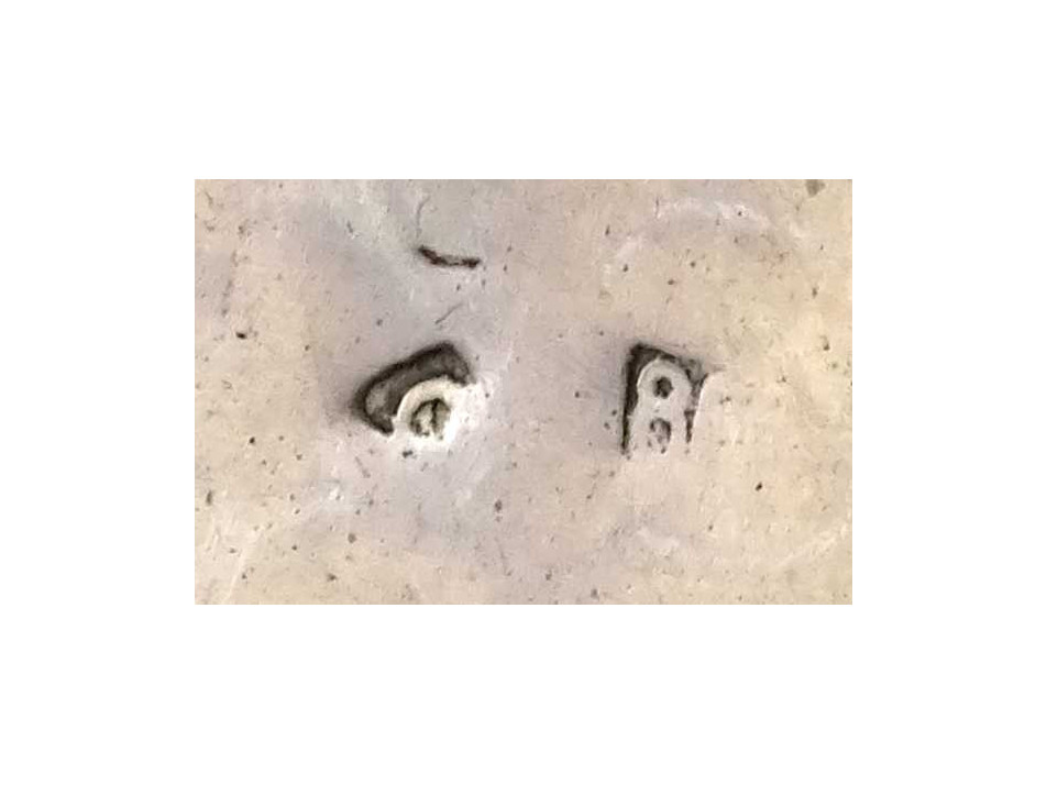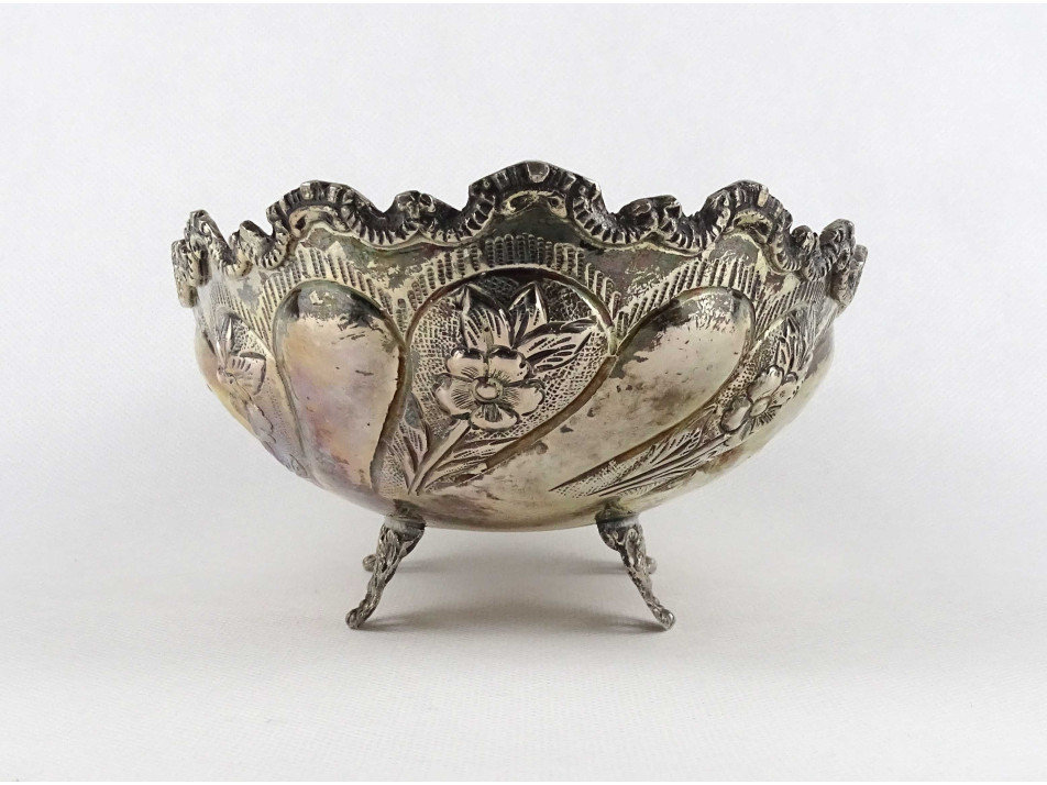 Antik, négy lábon álló, cizellált, domborított virágdíszes, 800-as finomságú ezüst asztali kínáló tál, asztalközép. Alján felülről beütött, erősen kopott 800-as finomságú ezüst jelzés, mellette mesterjegy, lásd fotó.