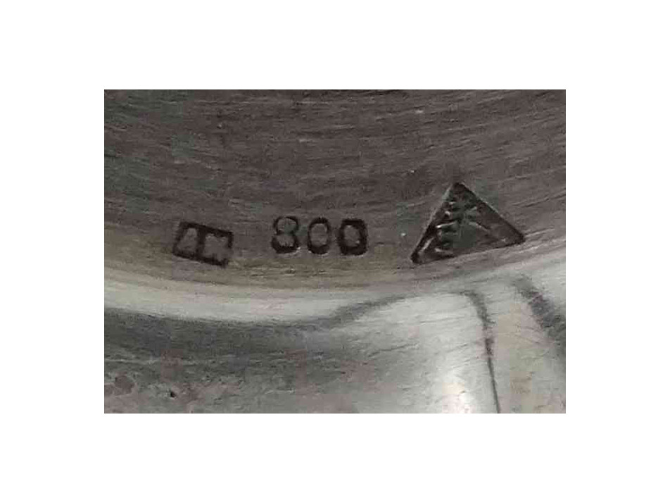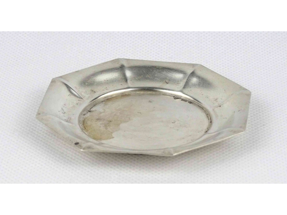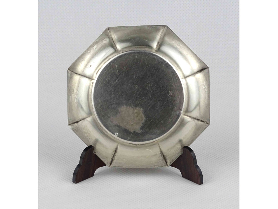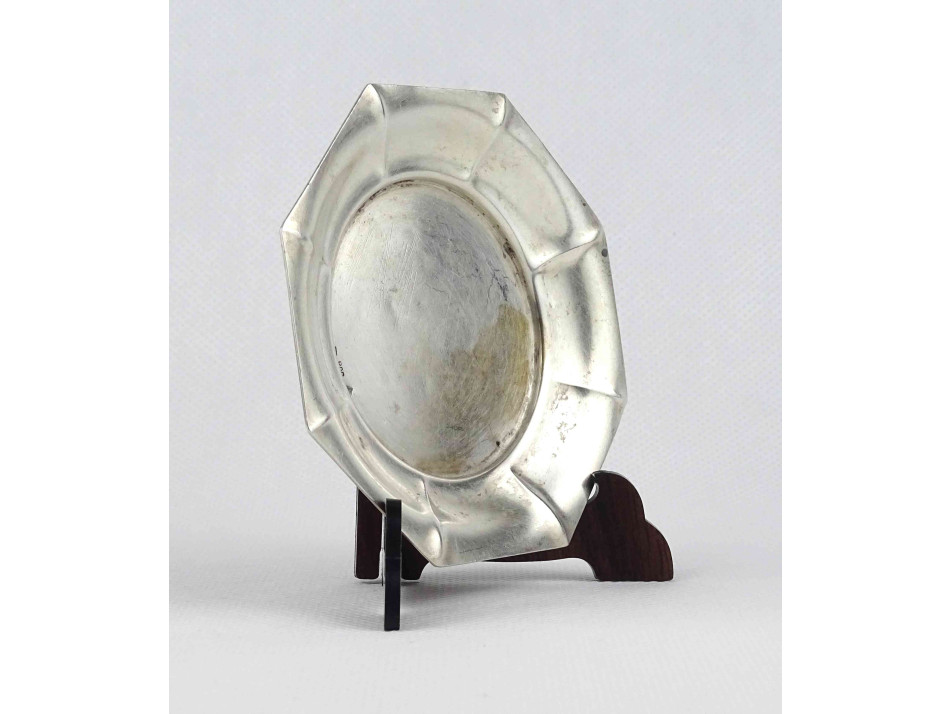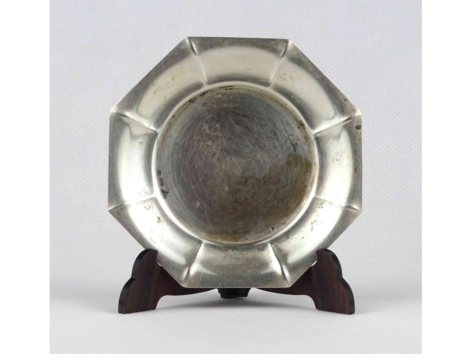 Régi, szép állapotú, kis méretű nyolcszög, alakú 800-as ezüst tálka, kis tál, hamutál. Rajta felülről beütött 1941-ig használt Cseszlovák kettőskeresztes 5-ös, 800 ezredrész finomságú fémjel, mellette 800 jelzés és "AN" mesterjel.