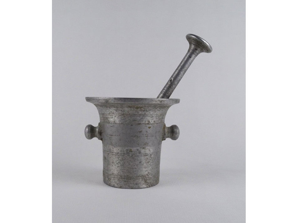Régi, szép állapotú, nagyméretű alumínium mozsár törővel együtt.