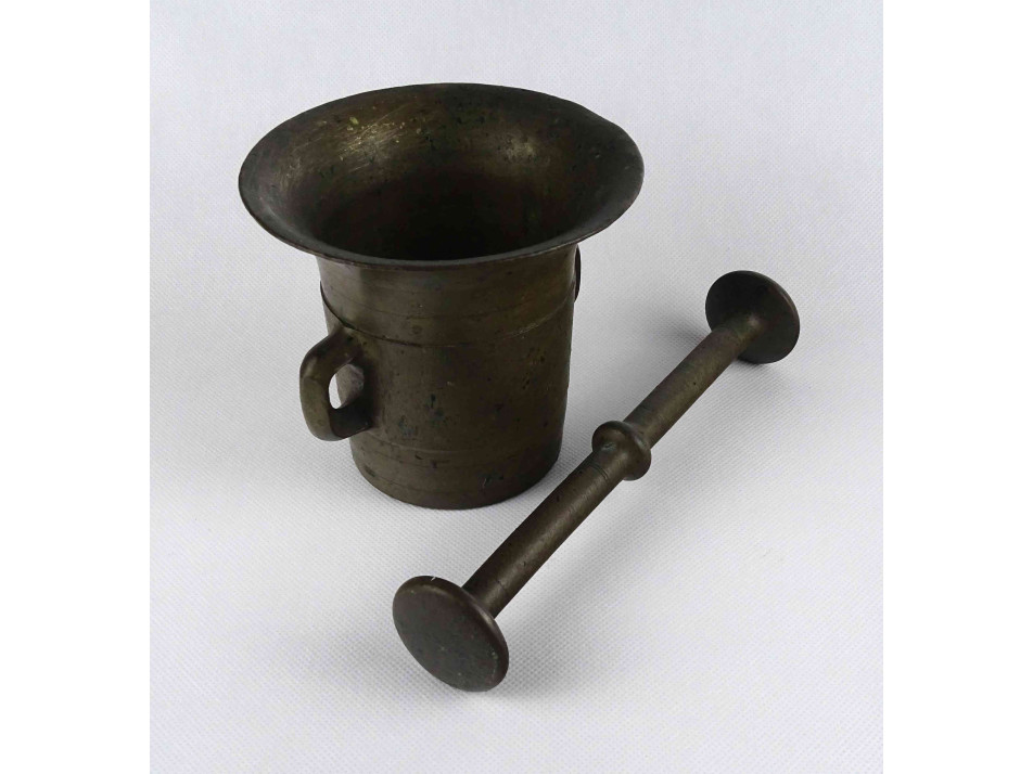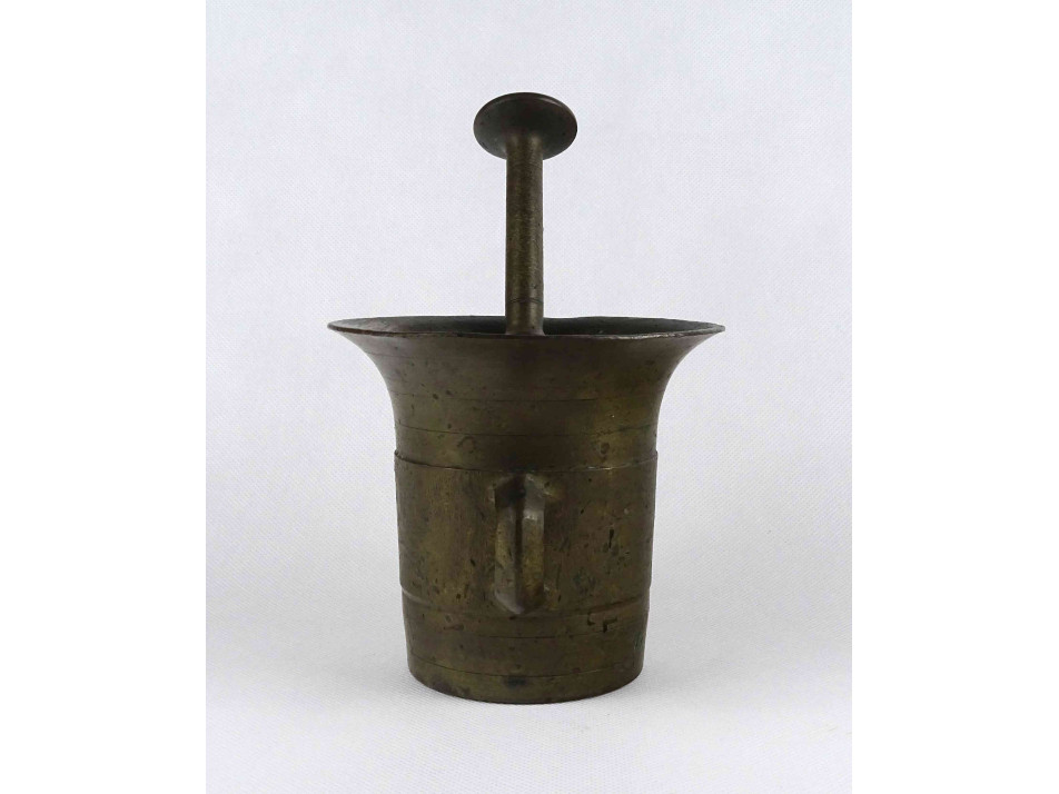 Ritkán előforduló, bronz mozsár fajta. Szögletes fülű, oldalán kalapált díszítésű, patinás bronz mozsár.