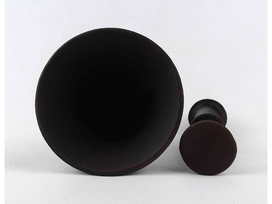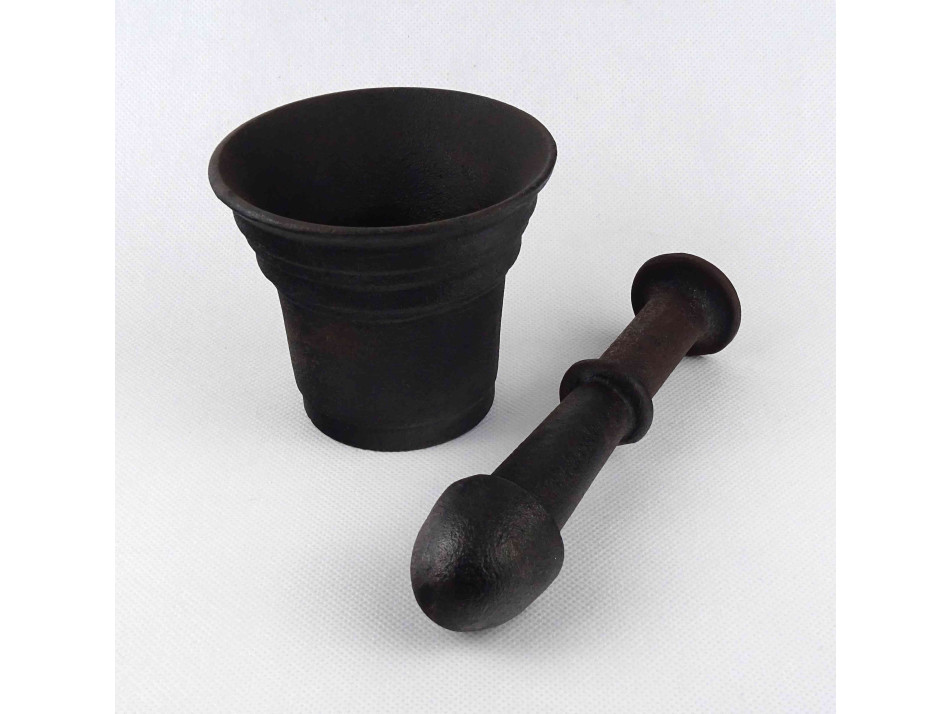 Antik, öntöttvasból készült, különleges fületlen mozsár, vas mozsár, ugyancsak különleges alakú aszimmetrikus törővel.