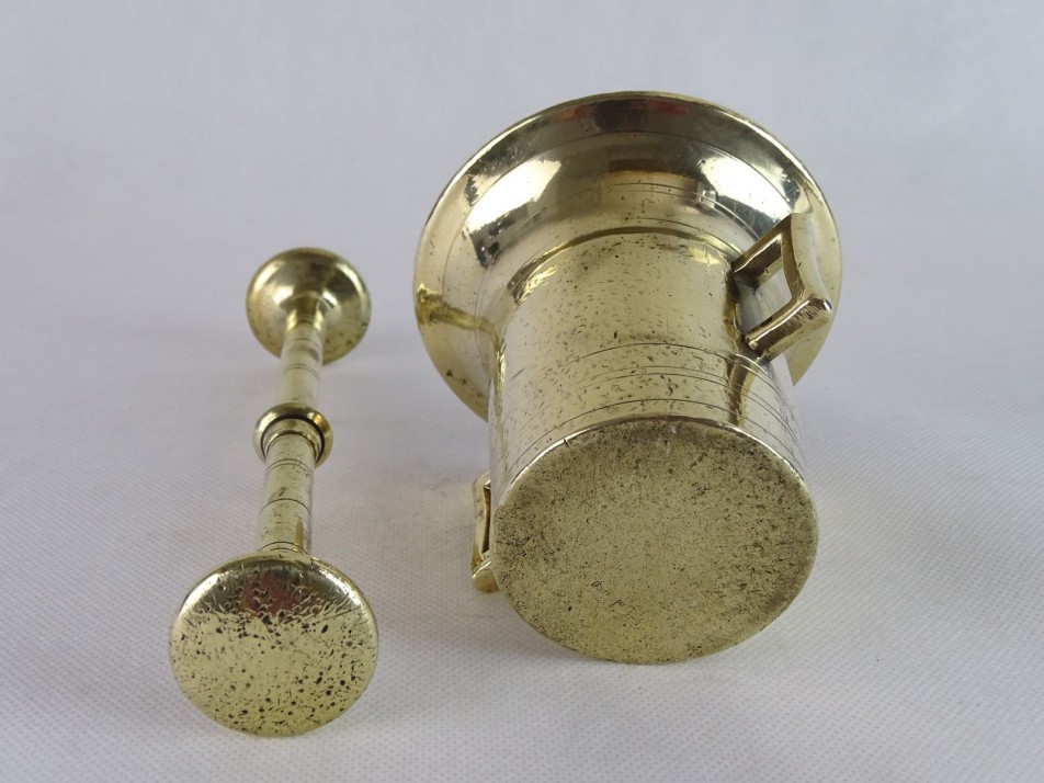 Régi, kisméretű, szögletes fülű réz mozsár törővel. Dísznek és használatra egyaránt tökéletes.