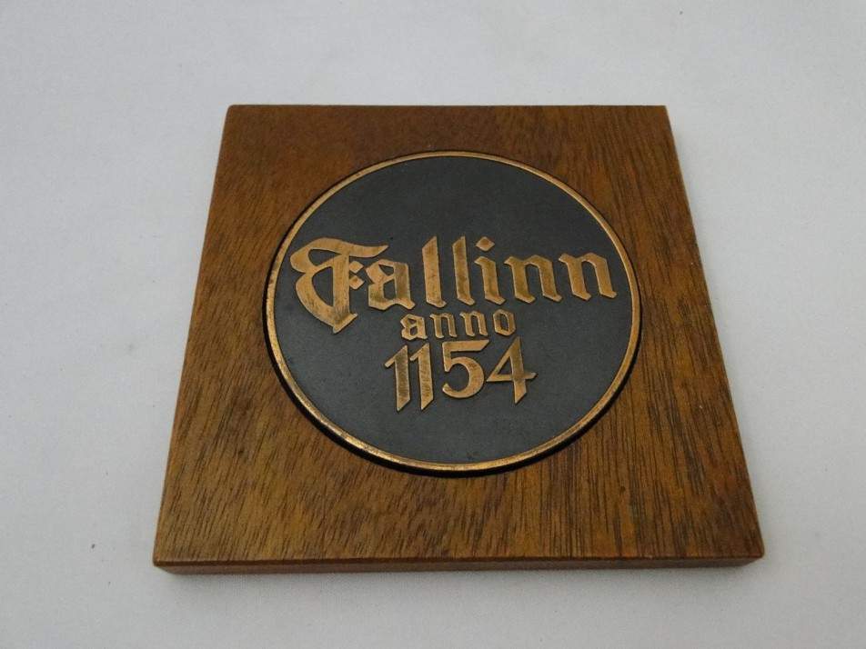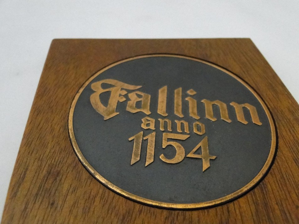 Fa talpba illesztett nagyméretű kétoldalas emlékérem, emlékplakett, díszplakett. Egyik oldalon Tallin városképe látható, másik oldalon felirat: