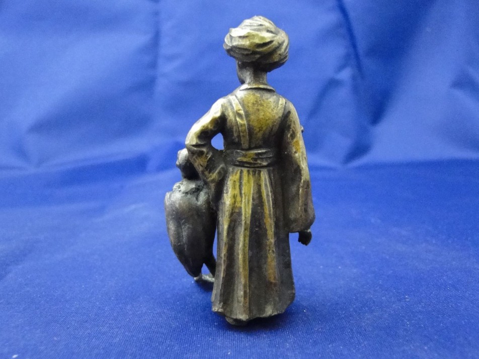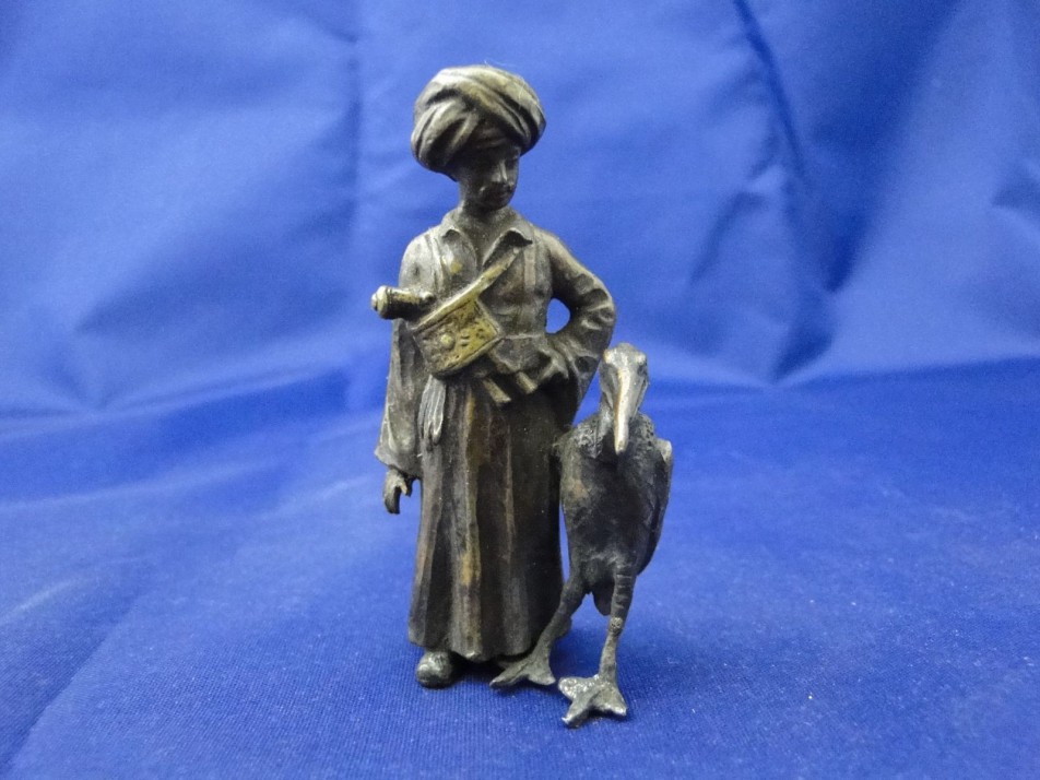 Miniatűr, picike, turbános, fegyveres arab figura egy marabuval. Rendkívül ritka téma, nagyon szépen kidolgozott bronz szobor.