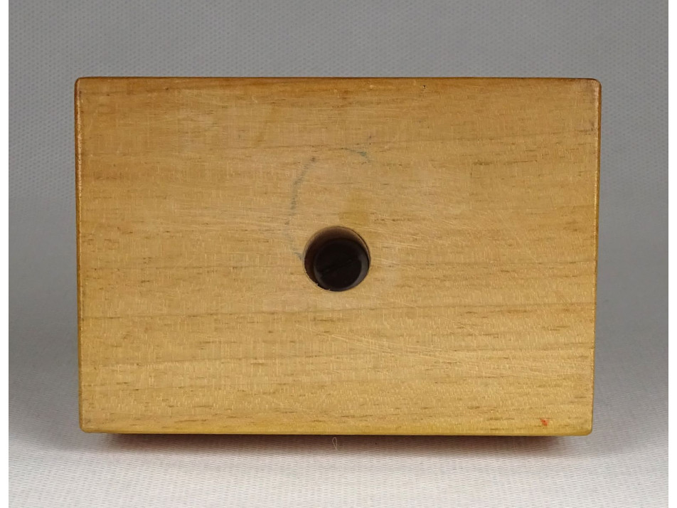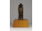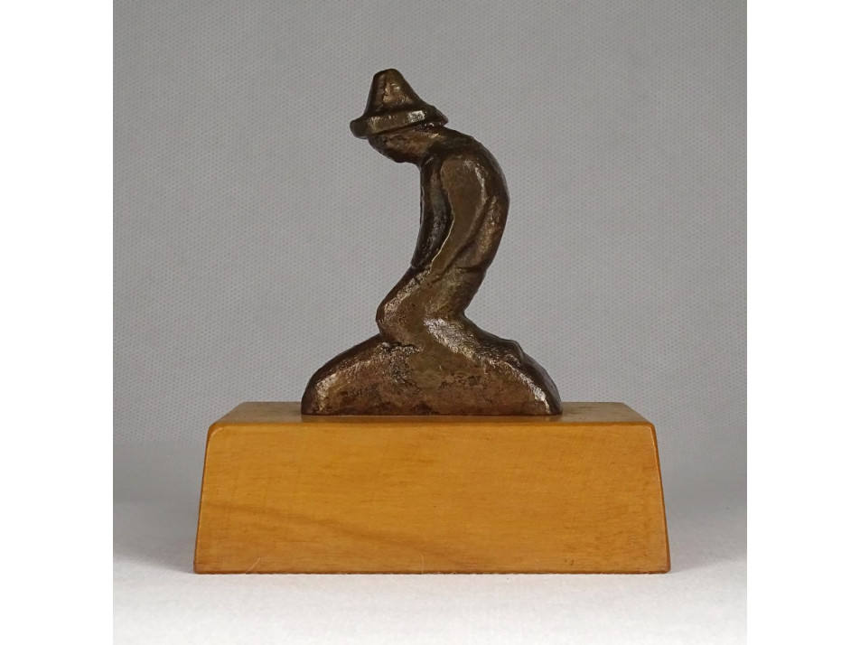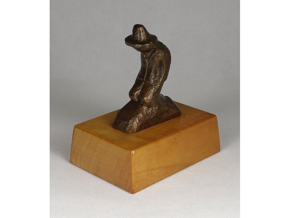 Vastag fa talapzaton kis méretű bronz szobor. Térdelő kalapos férfi.