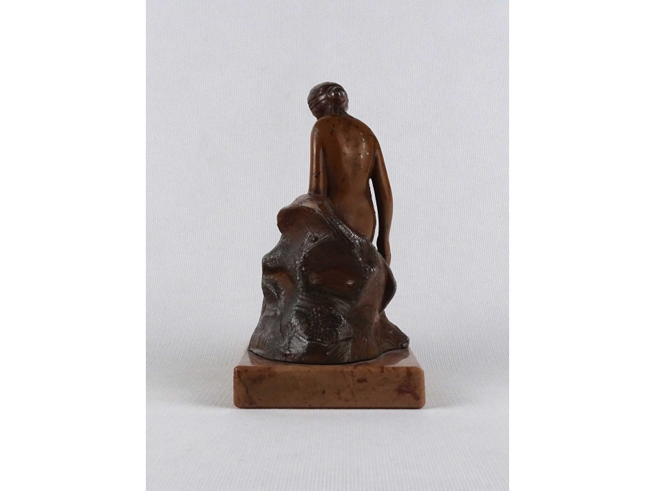 Szép állapotú, sziklán ülő fiatal lányt ábrázoló szecessziós akt szobor, ón szobor márvány talapzaton.