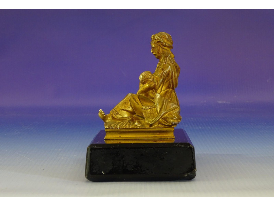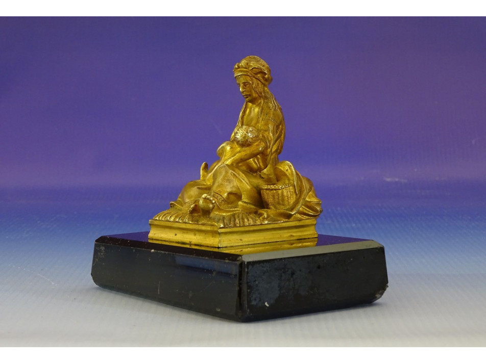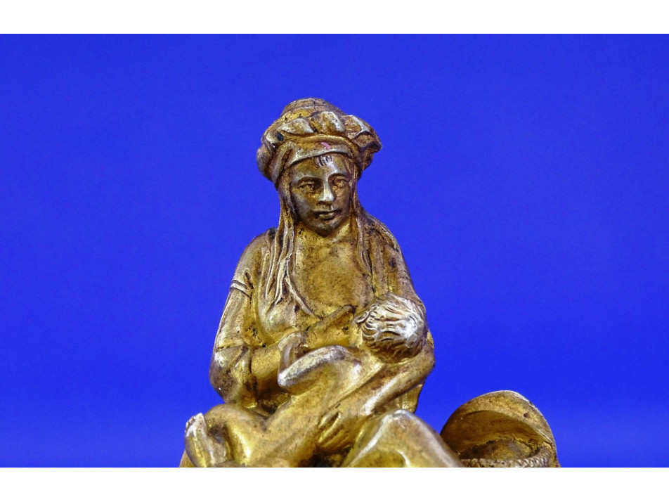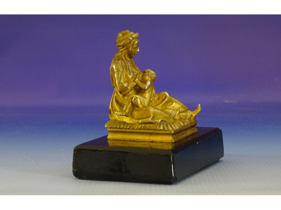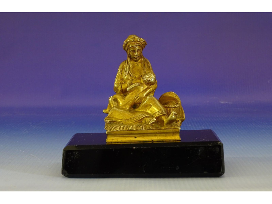 Régi, szépen kidolgozott, tűzarany keleti, arab gyermekét szoptató nő szobor fekete márvány talpon. A szobor hibátlan állapotú, a márvány talapzat kicsikét sérült, lásd fotó.