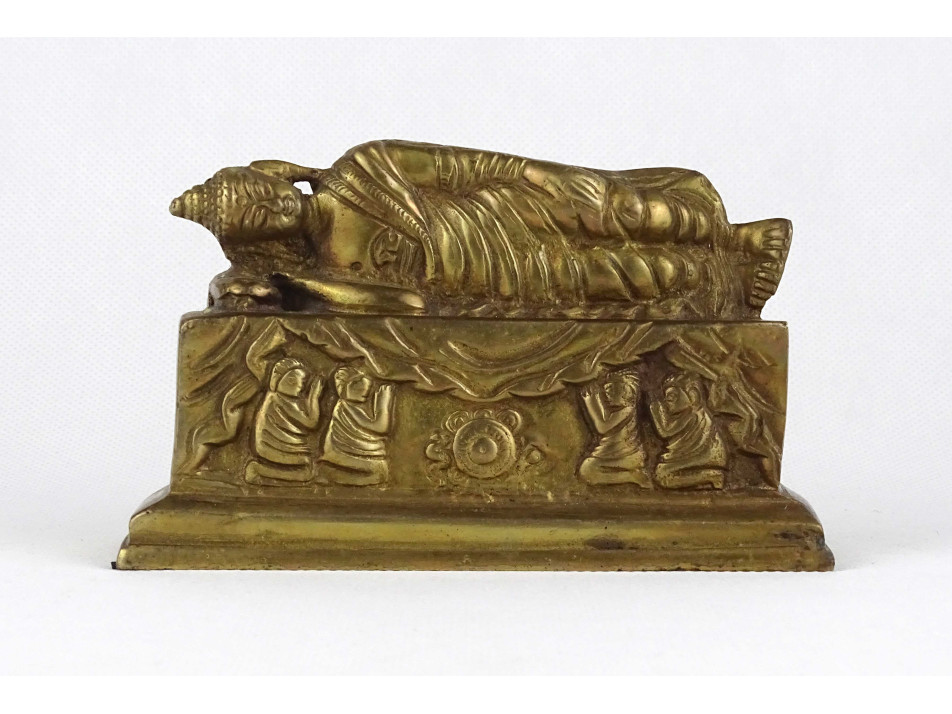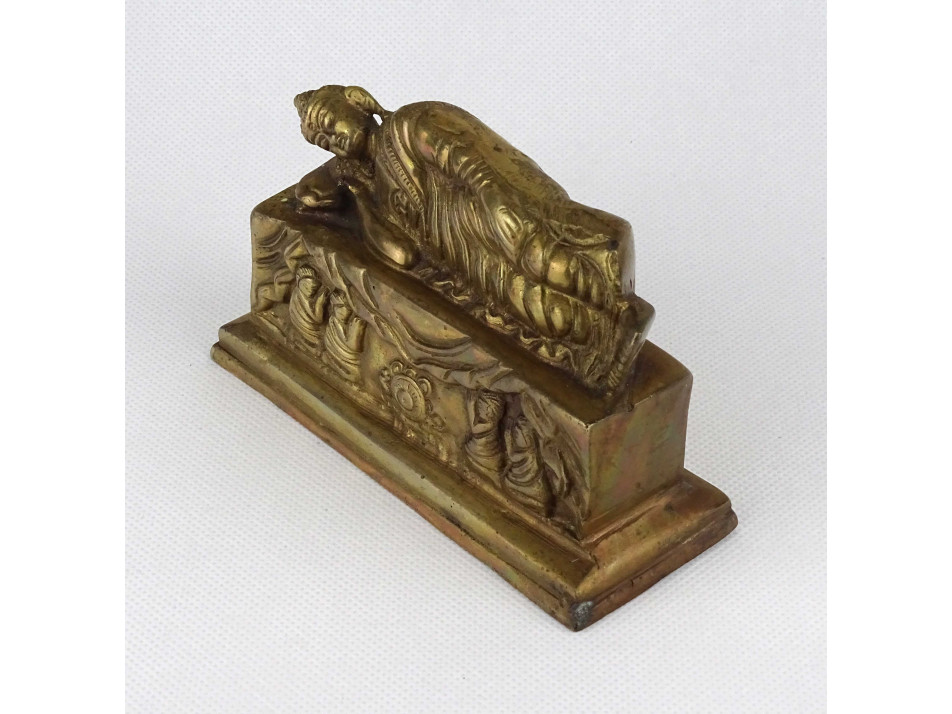 Antik, hibátlan állapotú, Buddhát fekvő testhelyzetben, egy oltáron, vagy talapzaton ábrázoló bronz szobor. Részletes minden oldalról kidolgozott Buddha szobor, bronz kisplasztika.
