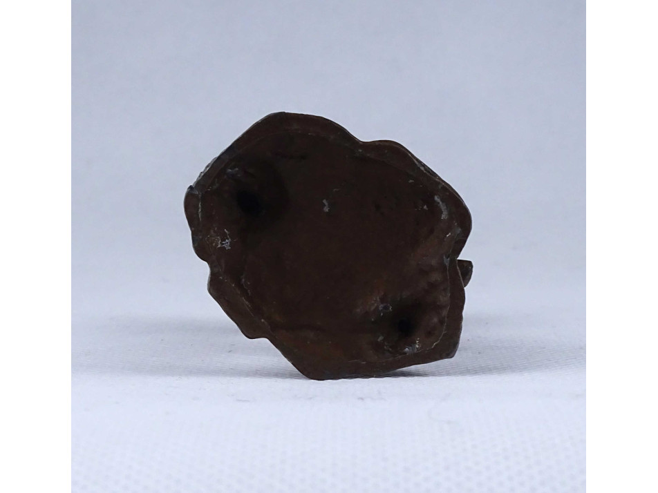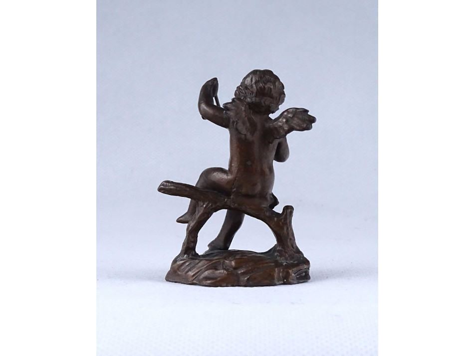 Antik, kisméretű, bronz színűre festett ón szobor, puttó, angyal kezében hangszer, triangulum. A talapzat hátulján, sérülés, repedés látható