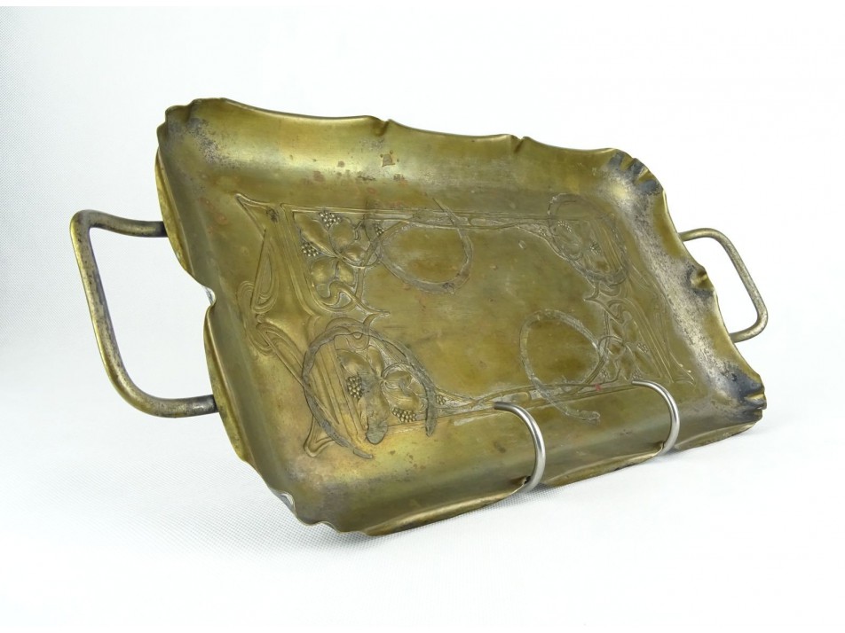 Jelzett WMF vörösréz századeleji tálca, rajta plasztikus szecessziós díszítés. Alsó felén korábbi ezüstözés nyoma jól látható. Alján madaras jelzés: WMF
