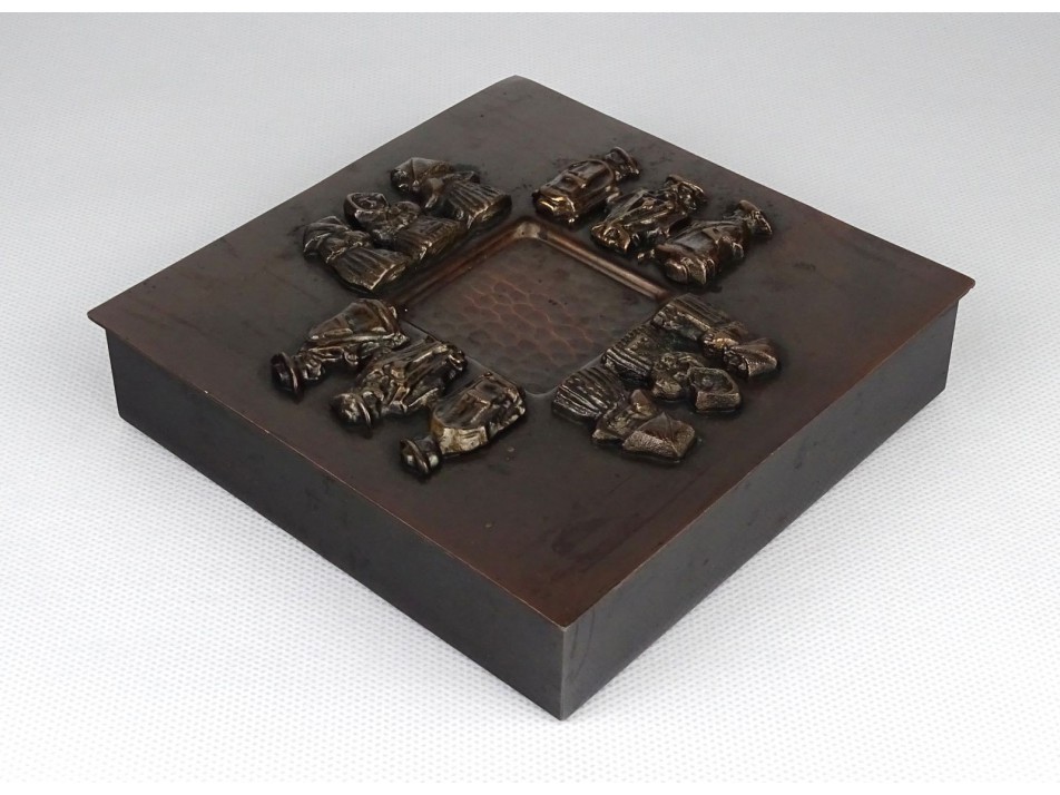 Régi kis méretű réz asztali dísztárgy, doboz, díszdoboz. Tetején domborműves, népviseletes többalakos díszítés látható. Belseje fa betétes.