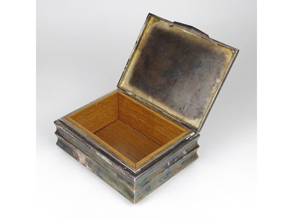 Szép állapotú jelzett fabetétes cigaretta kínáló doboz, kártyadoboz vagy ékszertartó doboz szelence. Pénzverdei ezüstözött alpakka.
