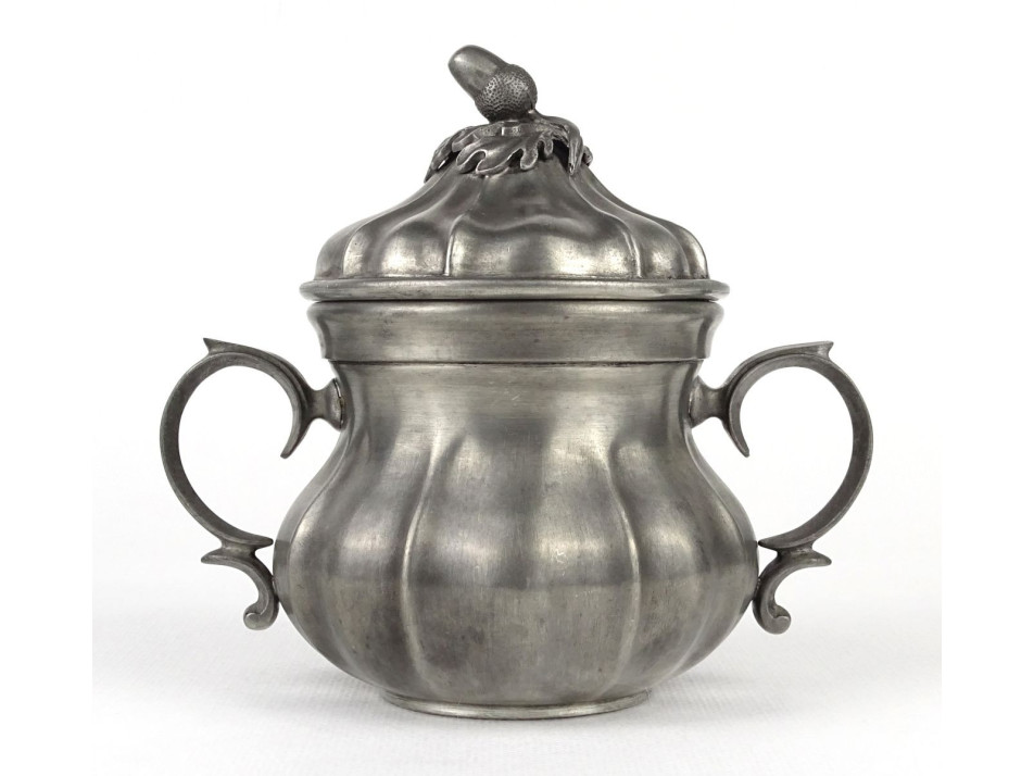 Hibátlan állapotú, jelzett régi fedeles ón bonbonier, tároló doboz. Tetején tölgyfa levél és makk díszítéssel.
