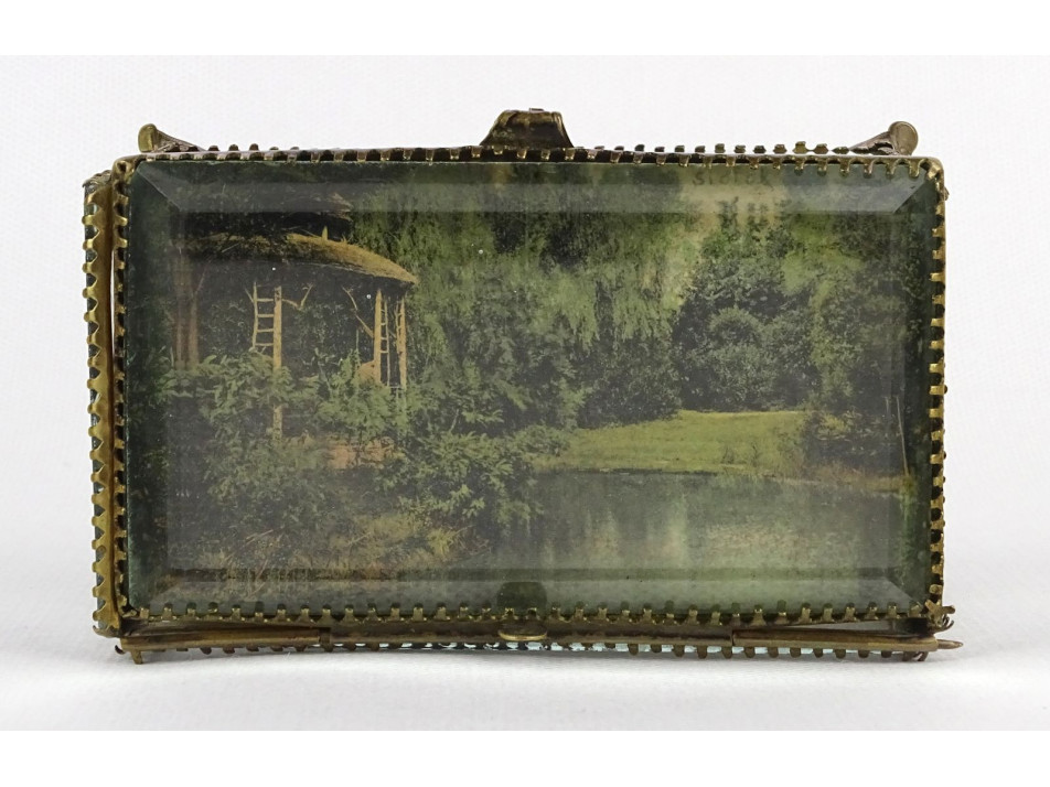 Négy pici lábon álló, réz keretes, üveg betétes kis méretű szelence, gyűrűtartó, ékszertartó az 1800-as évek végéről. Tetején csiszolt üveglap alatt színezett kép látható. Belseje párnázott.