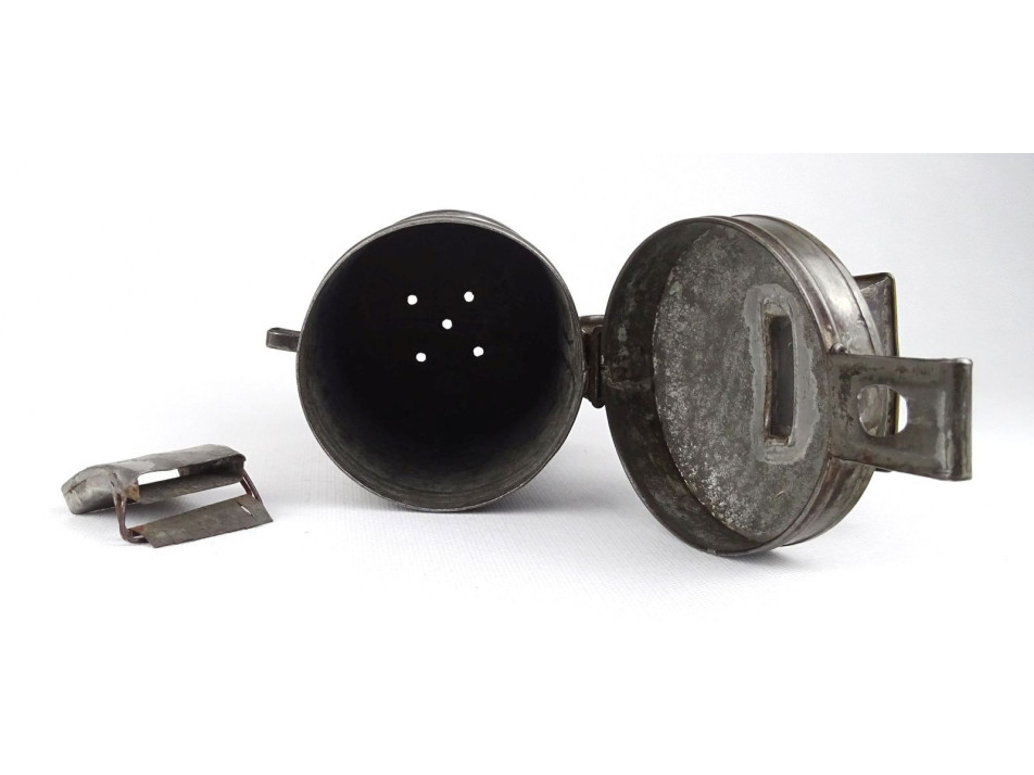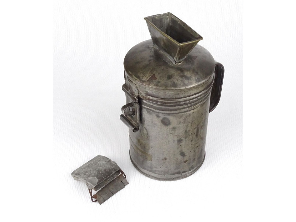 Antik, bádogból készült, füllel rendelkező persely. Lezárható. Templomi adománygyűjtő persely.