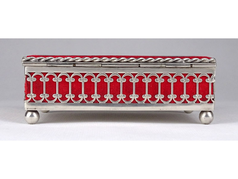 Szép állapotú, gyönyörű áttört ezüstözött fém bonbonier, kártyadoboz vagy cigaretta kínáló doboz. Piros mikroplüssel bélelt doboz, díszdoboz.