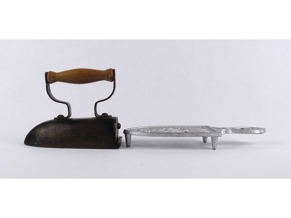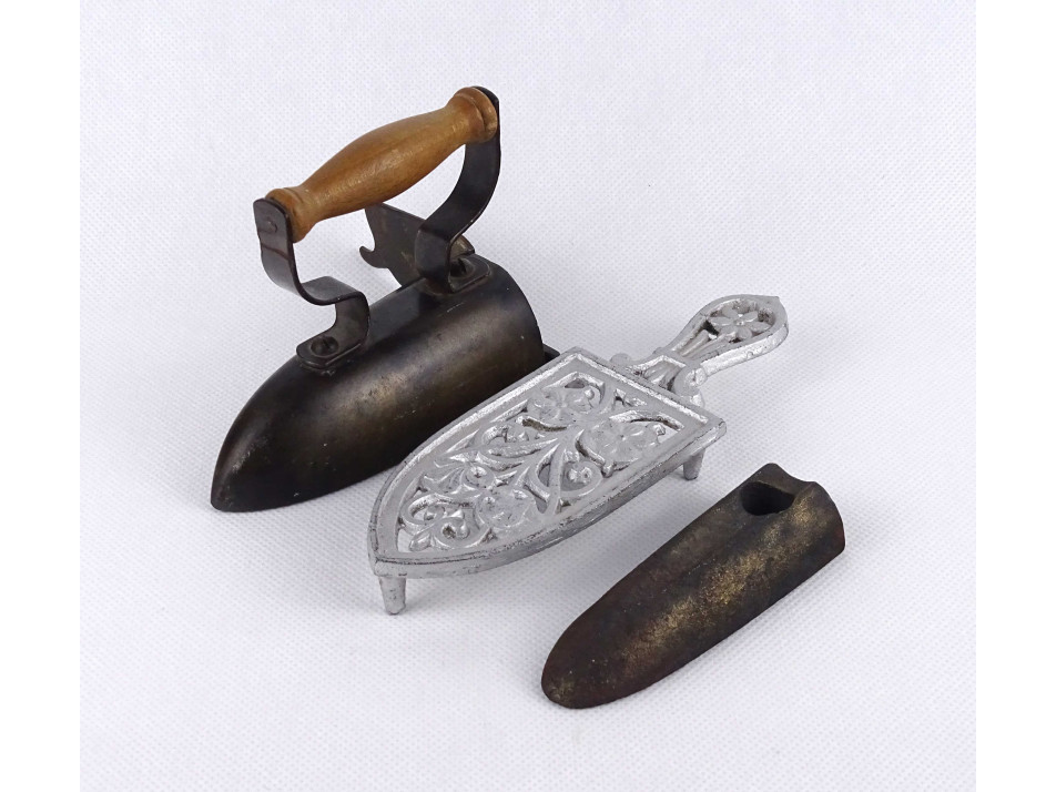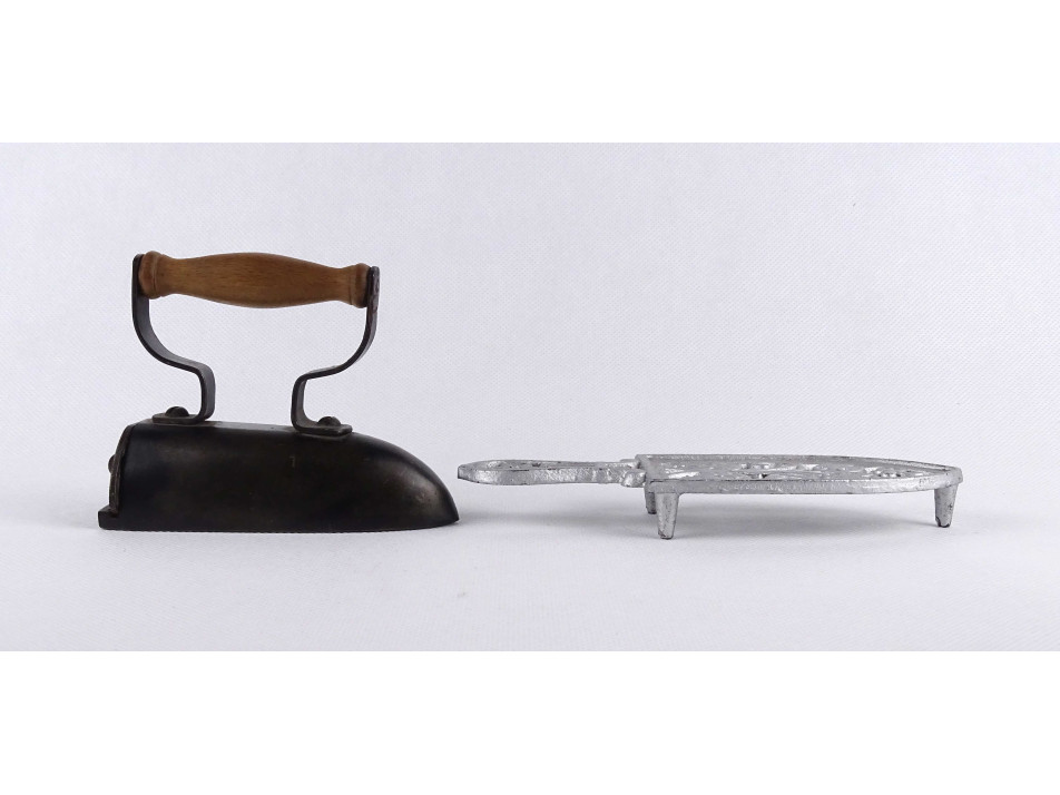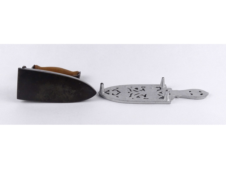 Antik, szép állapotú, kisméretű, vasmagos vasaló. Tartozik hozzá egy ezüst színűre festett, áttört, növényi inda mintás öntöttvas vasaló állvány.
