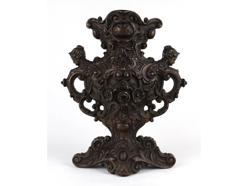 Antik nagy méretű öntöttvas díszváza. Barokkos forma, plasztikus virágokkal gazdagon díszítve. Füleinél női fej díszítések láthatók.