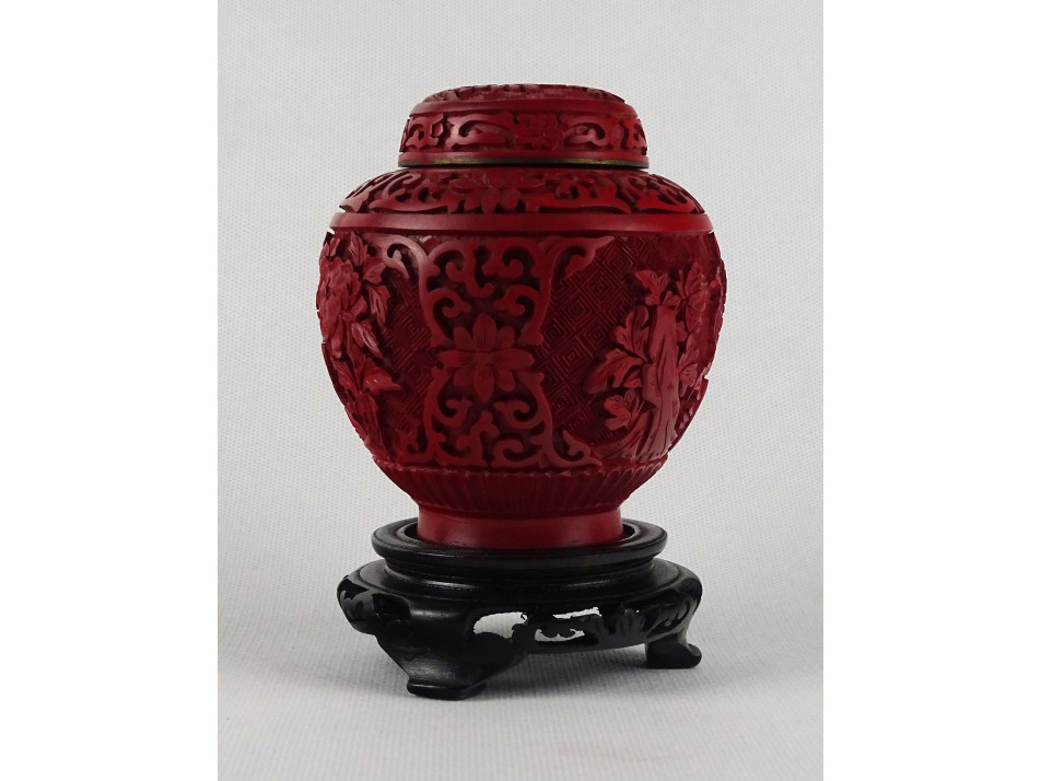 Régi piros cinóber keleti fedeles urna váza 13.2 cm